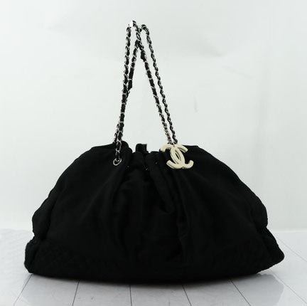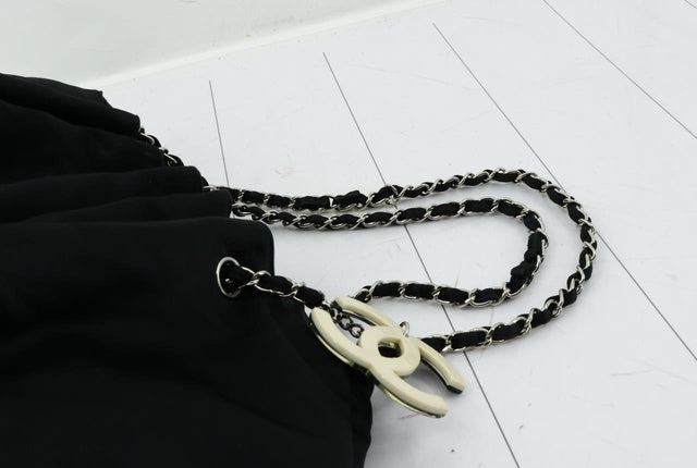 One Chanel Black Satin Melrose Cabas Large Tote Bag. Item is sold AS-IS. All available information is listed in the description and shown in the photo. Black satin Chanel Melrose Cabas tote with silver-tone hardware, quilted satin panel at base, dual chain-link and satin shoulder straps, grey satin interior lining, dual pockets at interior walls and drawstring closure at top. W: 58 cm (at widest) x H 35.5 cm x D: 5 cm