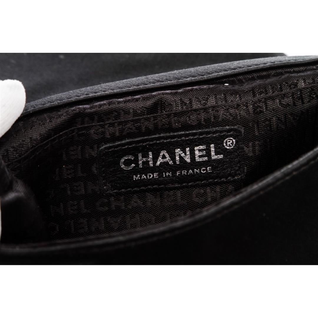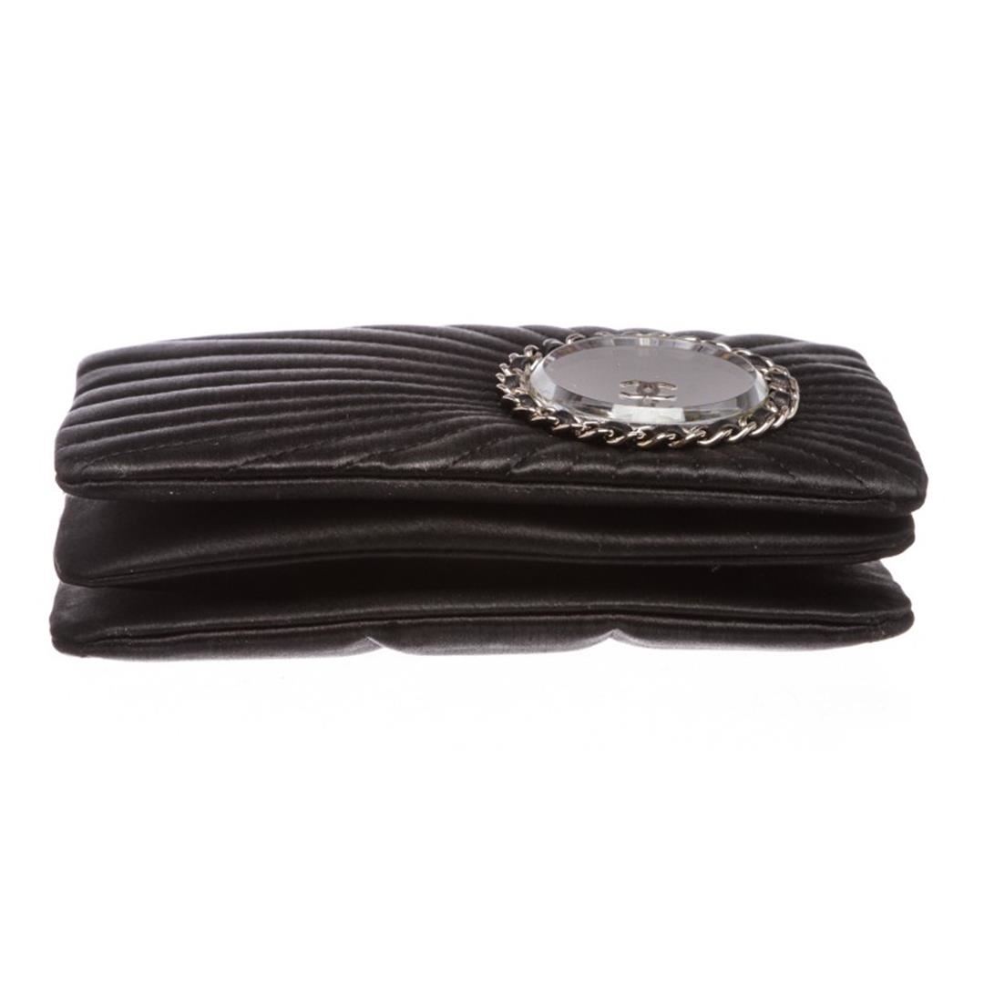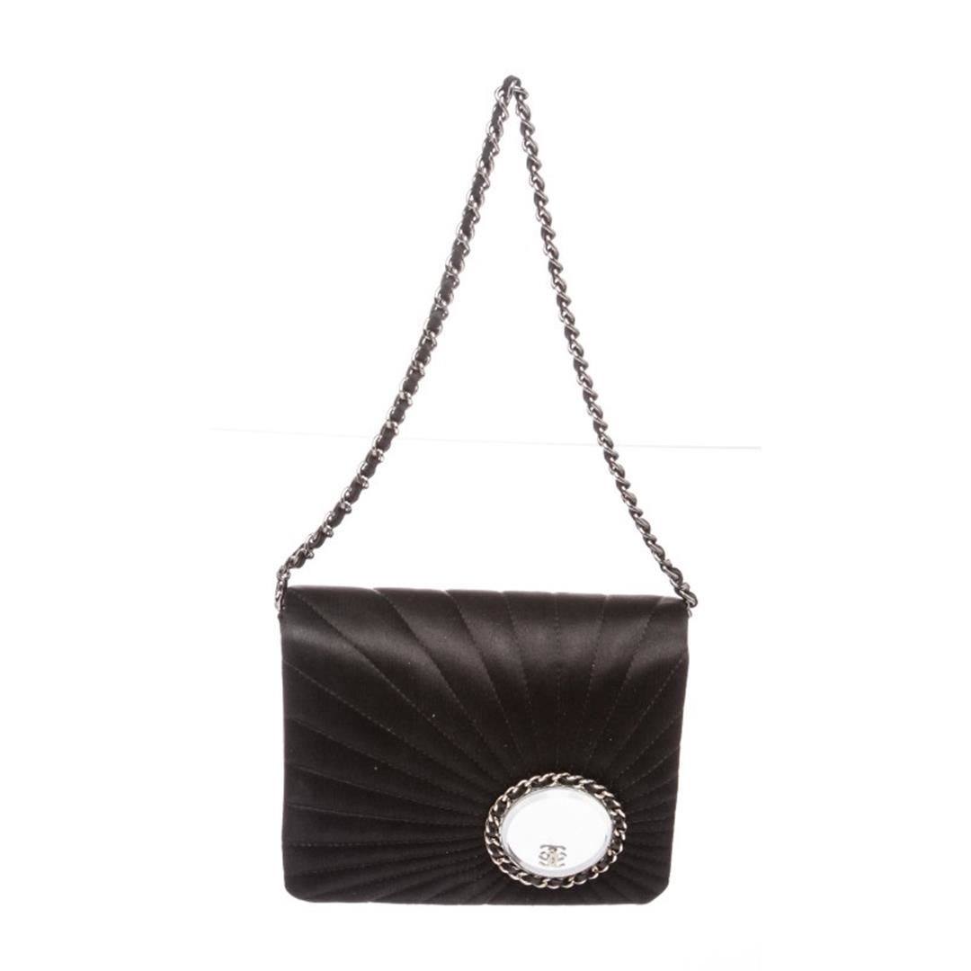 Black satin Chanel Vanity convertible clutch with silver-tone hardware, tonal leather trim, optional chain-link and leather top handle, mirrored adornment with chain-link and CC logo accents at front, tonal satin lining, single pocket at interior wall and magnetic snap closure at front flap. Item is Pre-Owned.