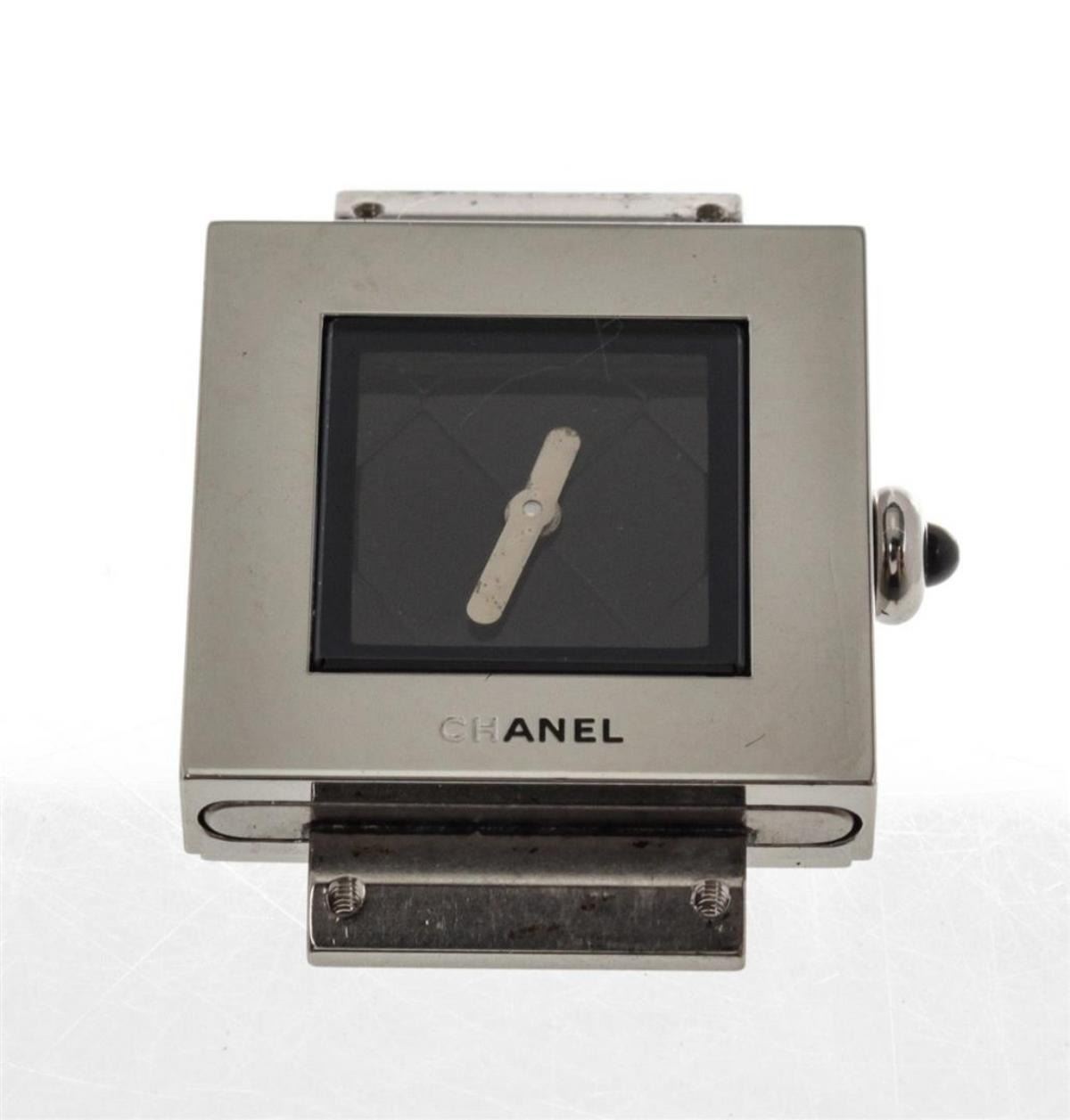 Chanel Black Silver Dial Quartz Ladies Watch with silver-tone hardware.