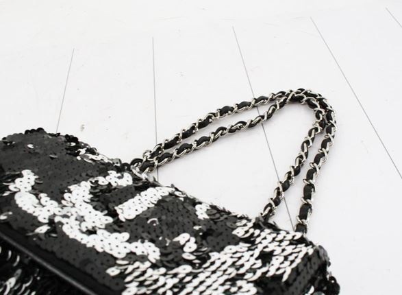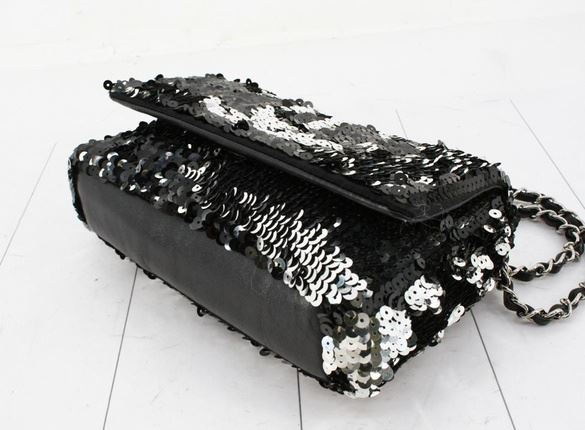 One Chanel Black Silver-tone Sequin Leather Summer Night Single Flap Shoulder Bag. Item is sold AS-IS. All available information is listed in the description and shown in the photo. Black and silver-tone sequined satin Chanel Summer Night Flap bag with silver-tone hardware, leather and chain-link shoulder straps, black satin lining, single zip pocket at interior wall and magnetic snap closure at flap. Height: 6.5" Width: 10" Depth: 2.5" Shoulder Strap Drop: 8.5"