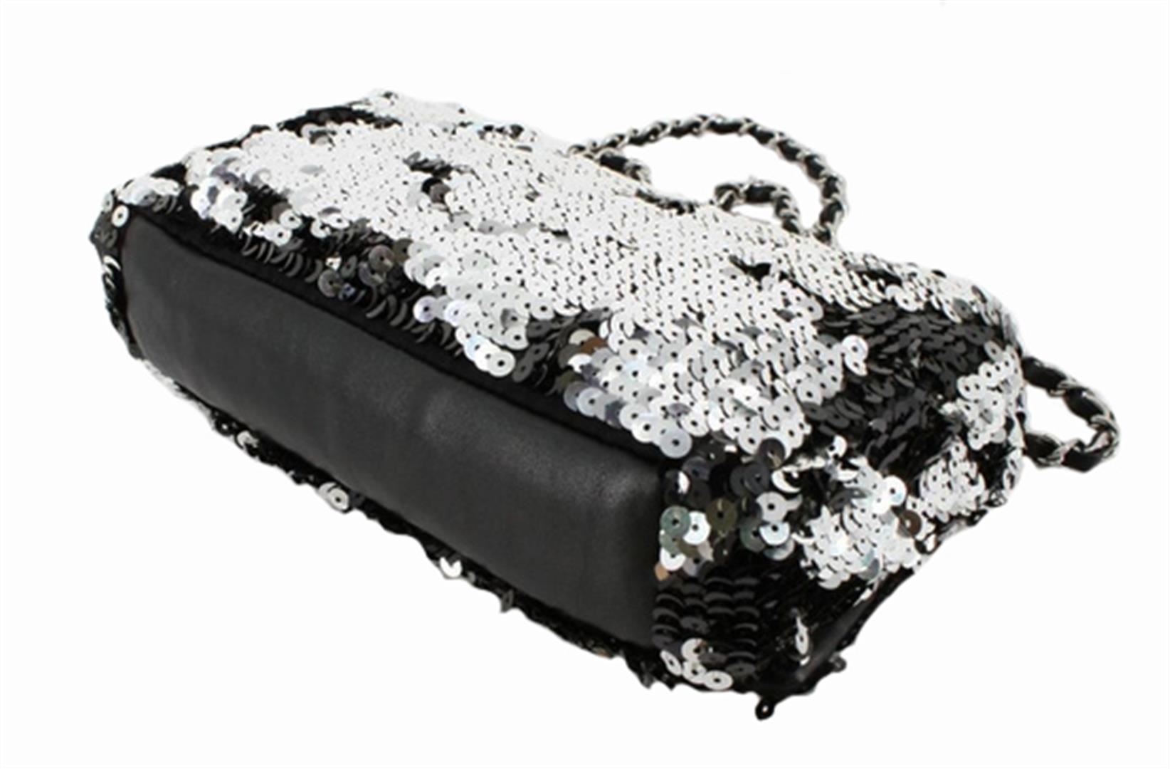 One Chanel Black Silver-tone Sequin Leather Summer Night Single Flap Shoulder Bag. Item is sold AS-IS. All available information is listed in the description and shown in the photo. Black and silver-tone sequined satin Chanel Summer Night Flap bag with silver-tone hardware, leather and chain-link shoulder straps, black satin lining, single zip pocket at interior wall and magnetic snap closure at flap. Height: 6.5" Width: 10" Depth: 2.5" Shoulder Strap Drop: 8.5"