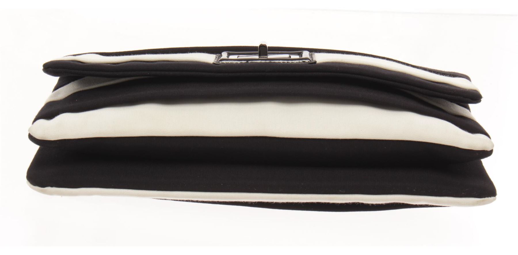 Chanel Black White Canvas 2.55 Reissue Flap Shoulder Bag. All available information is listed in the description and shown in the photos. Chanel 2.55 black and white striped canvas handbag with silver-tone hardware, chain handle and silver metal clasp, two interior compartments and one zipped. Width 28 cm, Height 16 cm, Depth 3 cm/ 11.02" x 6.29" x 1.18"