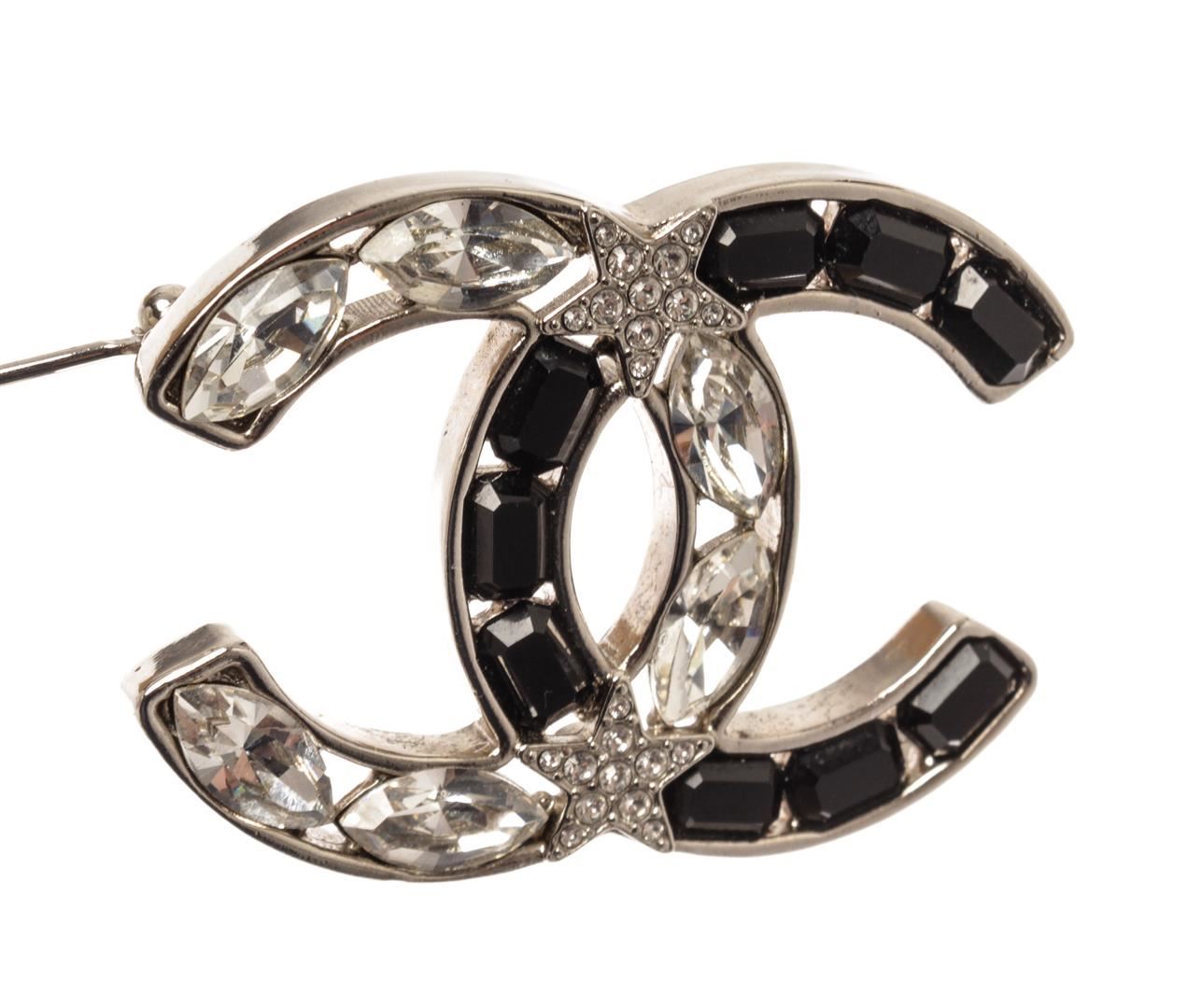 Chanel Black and Silver Pearl CC Rhinstone Brooch. All available information is listed in the description and shown in the photos. Chanel Black and Silver Pearl CC Rhinstone Brooch with marquise black stone, two tone crystal, and stars feature in a silver tone hardware, pin closure on back. Width:0.1" / 0.25 Cm