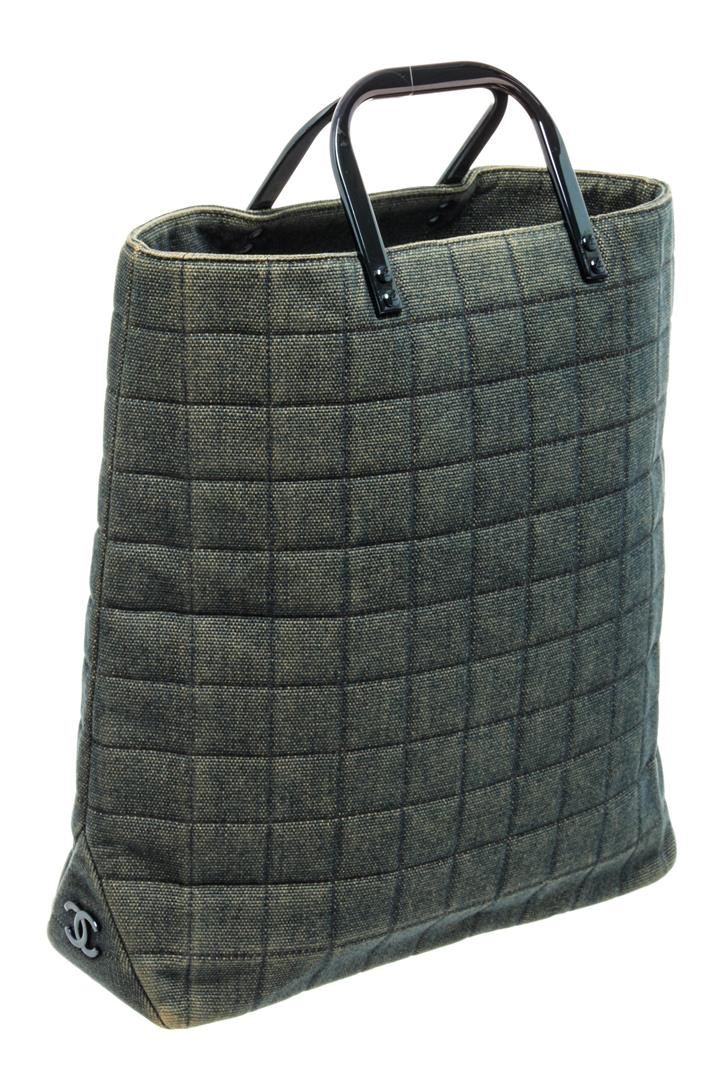 One Chanel Blue Denim Flat Quilted Tote Bag. Item is sold AS-IS. All available information is listed in the description and shown in the photo. Chanel Blue Denim Flat Quilted Tote Bag. Features silver hardware, blue denim exterior, tan leather interior, black metal straps, and a button closure.