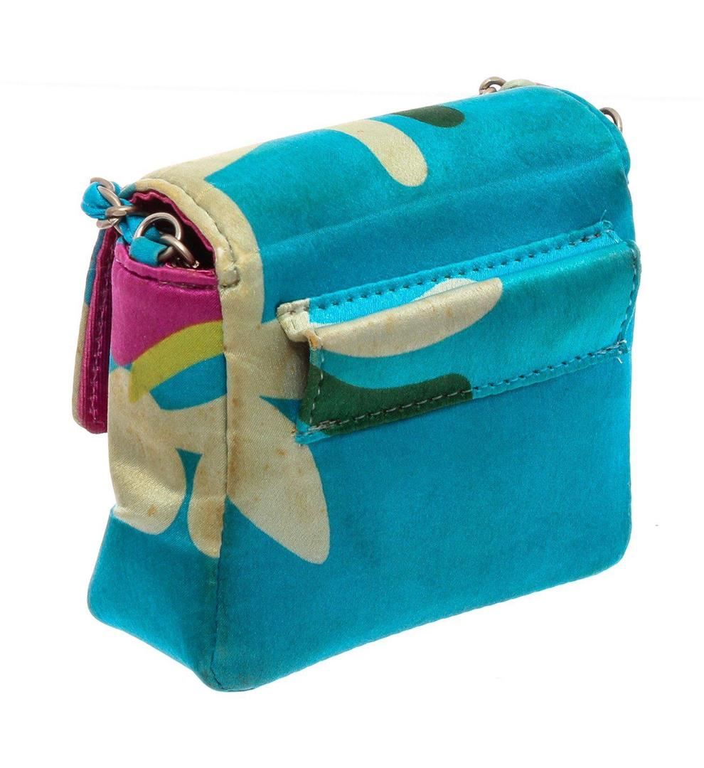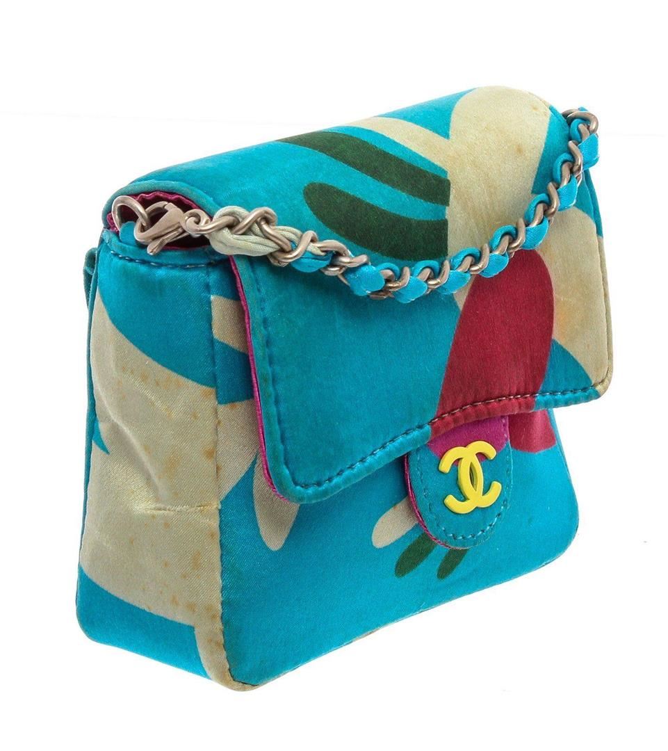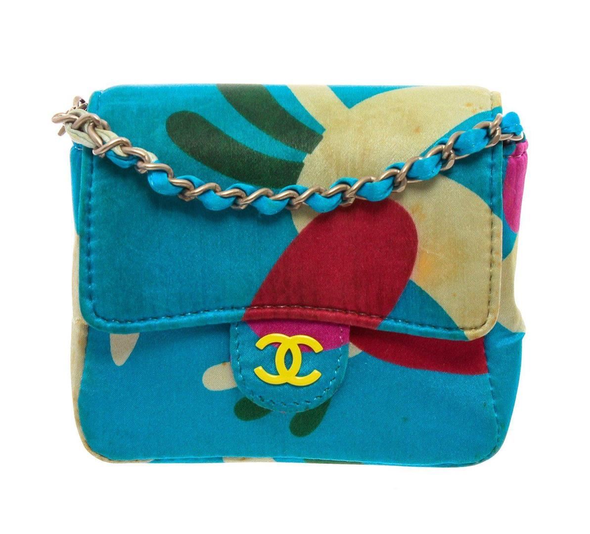 Chanel Blue Multicolor Satin Mini Chain Crossbody Bag. All available information is listed in the description and shown in the photos. Chanel Blue Multicolor Satin Mini Messenger Pouch features a satin multicolor print with a skinny belt loop on the back and has a detachable chain strap that can be worn over your shoulder. Please note: Some staining throughout, some small tears in the satin. please see photographs. 21929 MEASUREMENTS: Length 3.75 in / 10 cm Width 1.25 in / 3 cm Height 3.5 in / 9 cm Condition: Pre-Owned Good overall, please see photographs for detail.