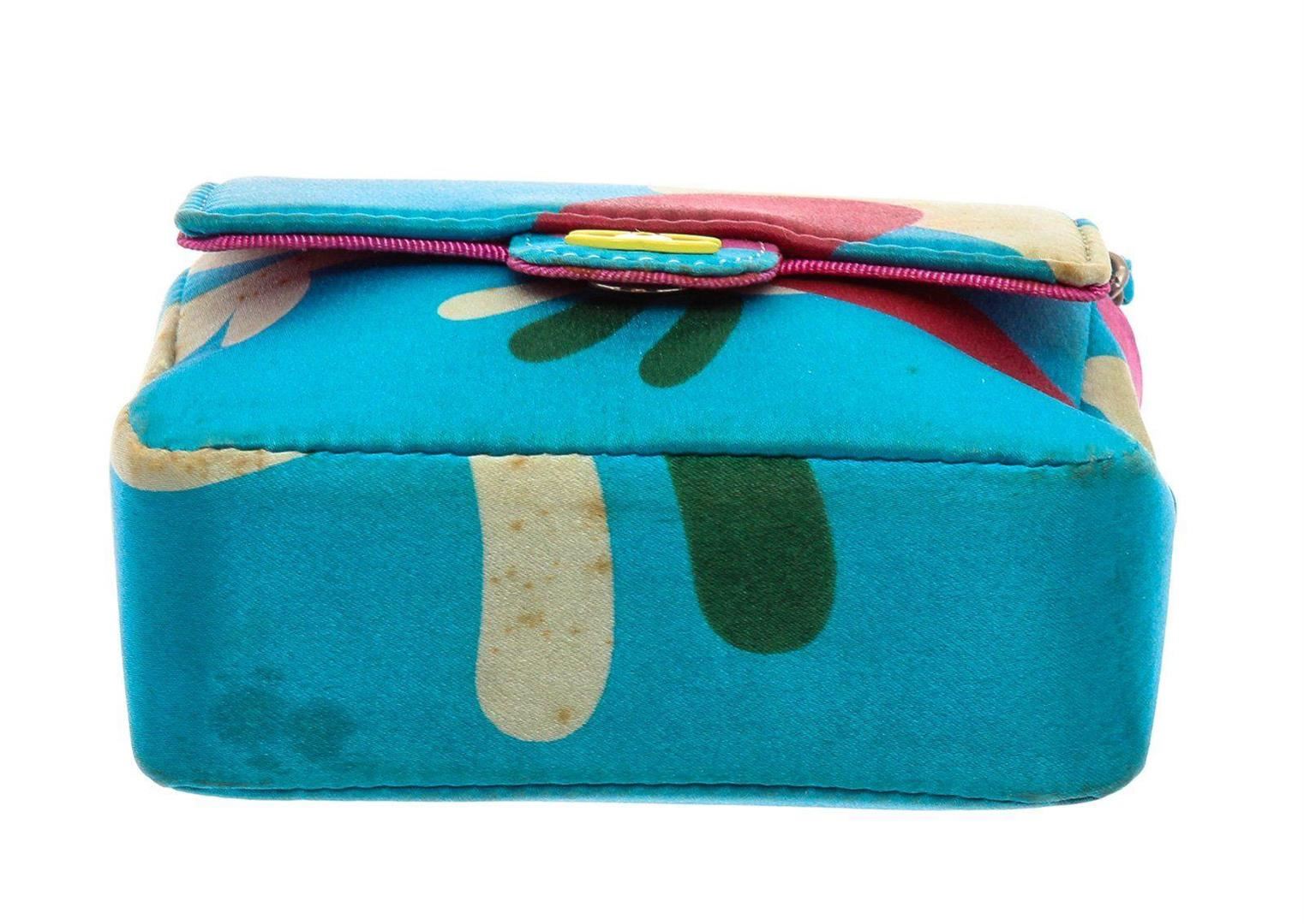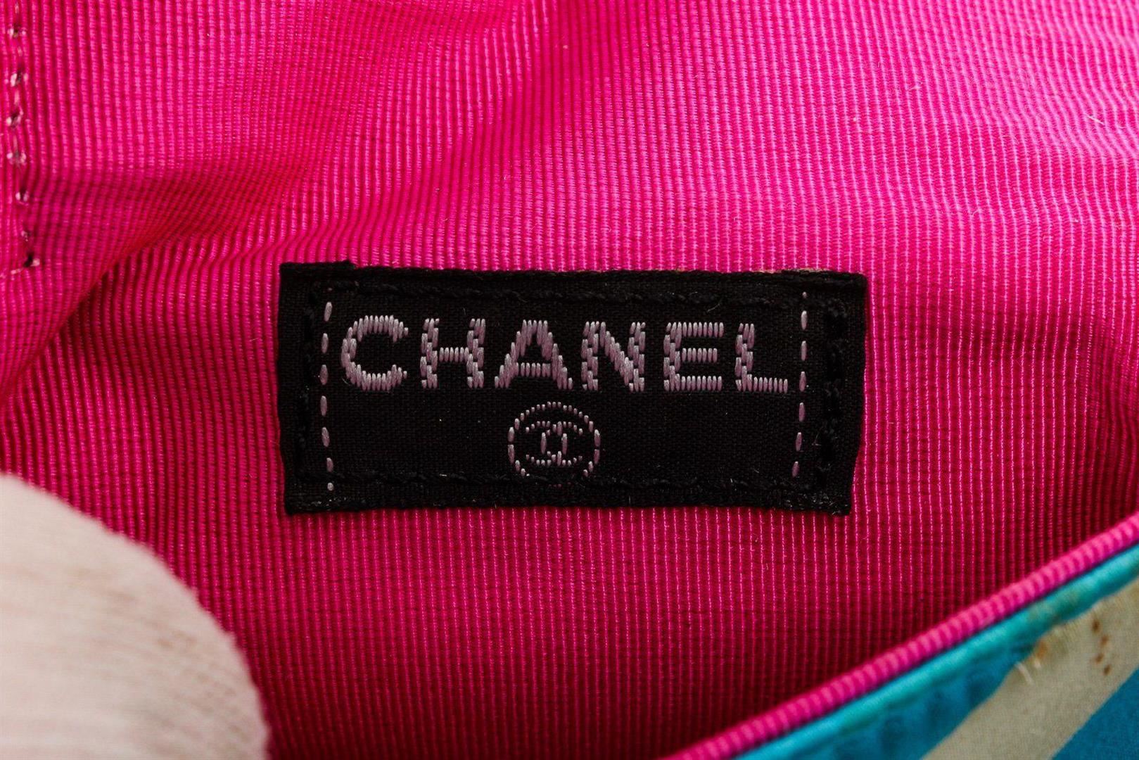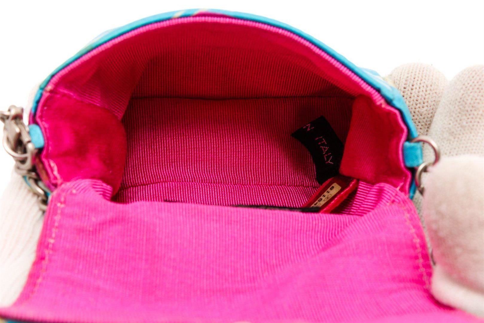 Chanel Blue Multicolor Satin Mini Chain Crossbody Bag. All available information is listed in the description and shown in the photos. Chanel Blue Multicolor Satin Mini Messenger Pouch features a satin multicolor print with a skinny belt loop on the back and has a detachable chain strap that can be worn over your shoulder. Please note: Some staining throughout, some small tears in the satin. please see photographs. 21929 MEASUREMENTS: Length 3.75 in / 10 cm Width 1.25 in / 3 cm Height 3.5 in / 9 cm Condition: Pre-Owned Good overall, please see photographs for detail.