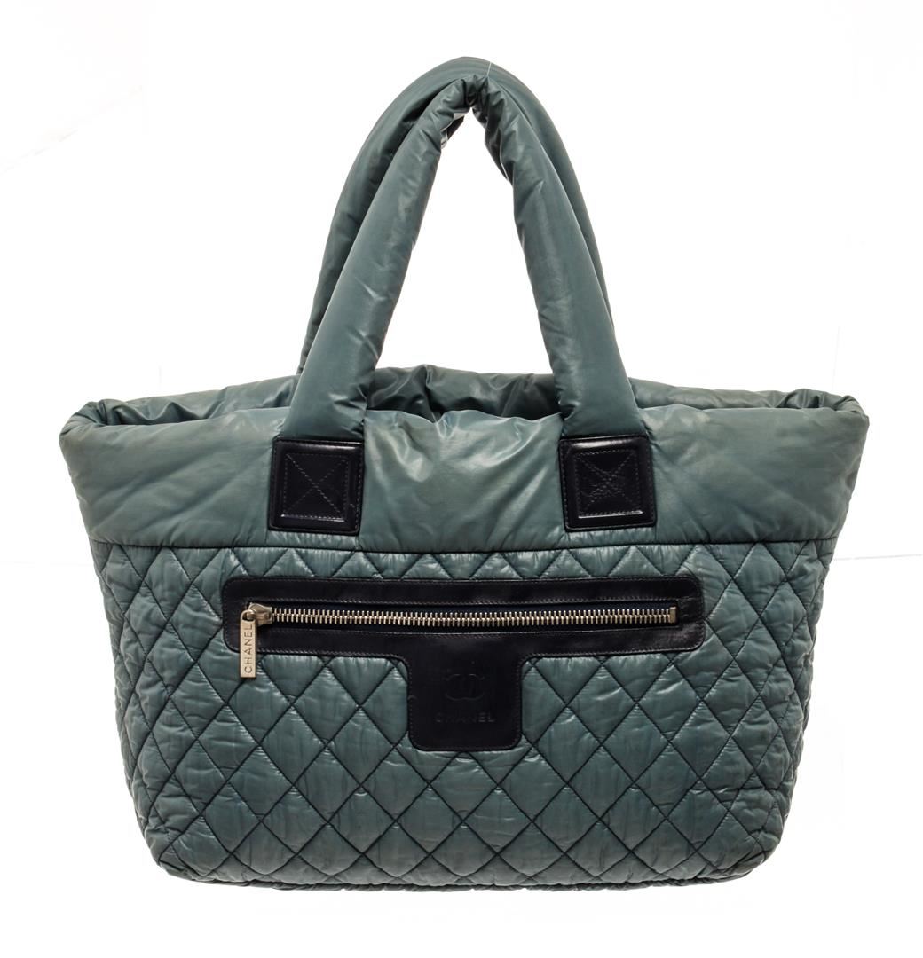 One Chanel Blue Quilted Nylon Cocoon Front Zipped Tote Bag. Item is sold AS-IS. All available information is listed in the description and shown in the photo. Chanel Blue Quilted Nylon Cocoon Front Zipped Tote Bag with silver-tone hardware, front zip pocket, black leather lining, dual leather top handles, and zip closure at the top. .