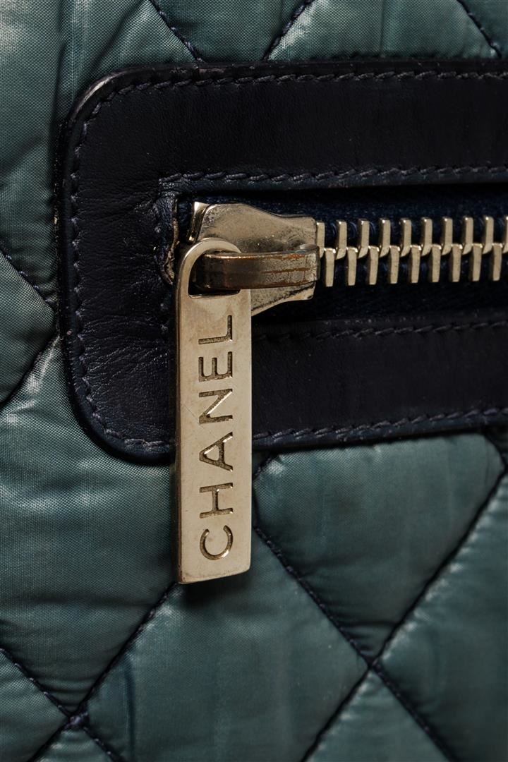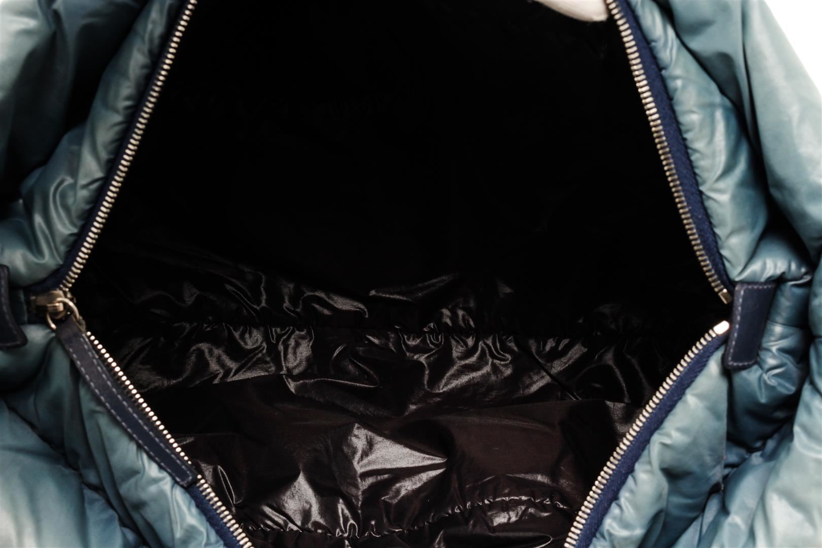 One Chanel Blue Quilted Nylon Cocoon Front Zipped Tote Bag. Item is sold AS-IS. All available information is listed in the description and shown in the photo. Chanel Blue Quilted Nylon Cocoon Front Zipped Tote Bag with silver-tone hardware, front zip pocket, black leather lining, dual leather top handles, and zip closure at the top. .