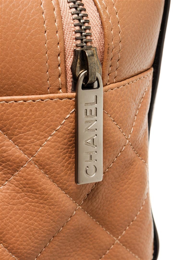 One Chanel Brown Black Quilted Caviar Mini Boston Bowler Bag. Item is sold AS-IS. All available information is listed in the description and shown in the photo. Chanel Brown Black Quilted Caviar Mini Boston Bowler Bag with brass hardware, foot base, exterior zip pocket, Chanel scripted logo at the front, brown leather lining, dual rolled leather handles, zip closure at the top. .