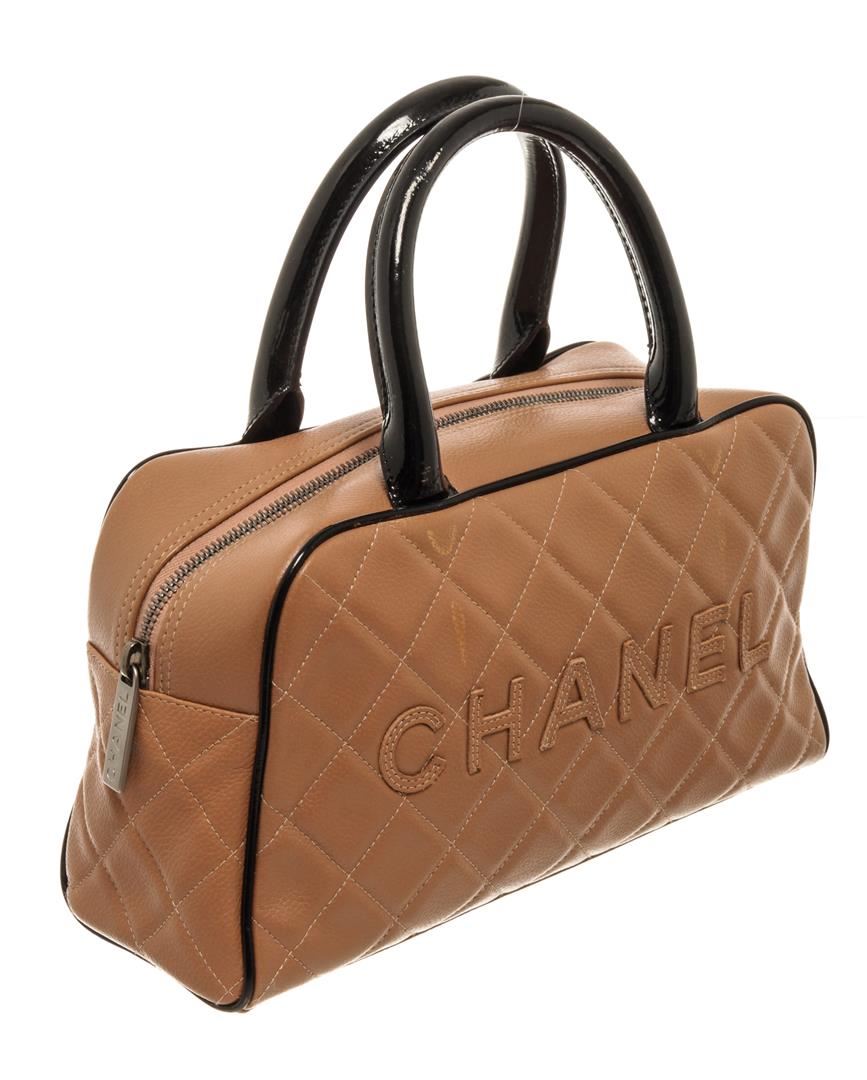 One Chanel Brown Black Quilted Caviar Mini Boston Bowler Bag. Item is sold AS-IS. All available information is listed in the description and shown in the photo. Chanel Brown Black Quilted Caviar Mini Boston Bowler Bag with brass hardware, foot base, exterior zip pocket, Chanel scripted logo at the front, brown leather lining, dual rolled leather handles, zip closure at the top. .