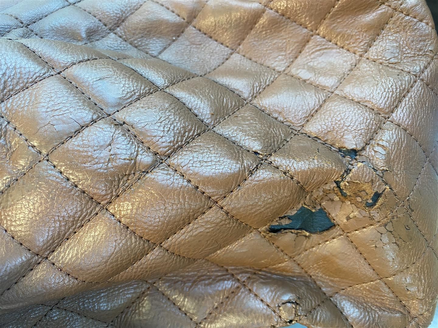 Chanel Brown Caviar Leather Chain CC Shoulder Bag. All available information is listed in the description and shown in the photos. Chanel Brown Caviar Leather Chain CC Shoulder Bag with gold-tone hardware, leather trim, interior flap pockets, chain leather shoulder strap, and flap closure. Please note: Bag has been redyed, peeling and creases on the quilted sections of the bag, some interior staining. Measurements: Length: 4 in / 10 cm Width: 11 in / 28 cm 8 in / 20 cm Condition: Pre-Owned Good overall, please see photographs for detail.