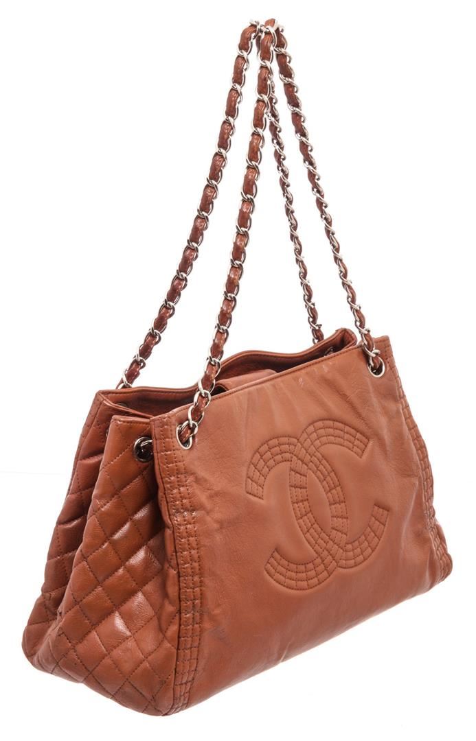 Chanel Brown Caviar Leather Chain CC Shoulder Bag. All available information is listed in the description and shown in the photos. Chanel Brown Caviar Leather Chain CC Shoulder Bag with gold-tone hardware, leather trim, interior flap pockets, chain leather shoulder strap, and flap closure. Please note: Bag has been redyed, peeling and creases on the quilted sections of the bag, some interior staining. Measurements: Length: 4 in / 10 cm Width: 11 in / 28 cm 8 in / 20 cm Condition: Pre-Owned Good overall, please see photographs for detail.