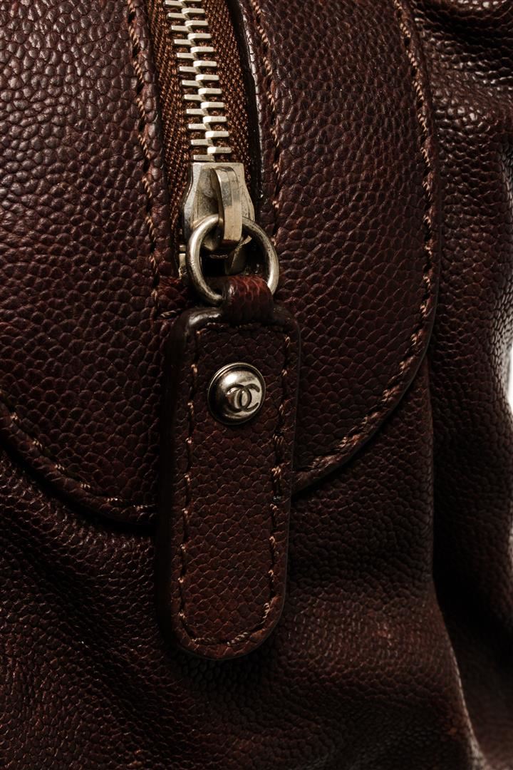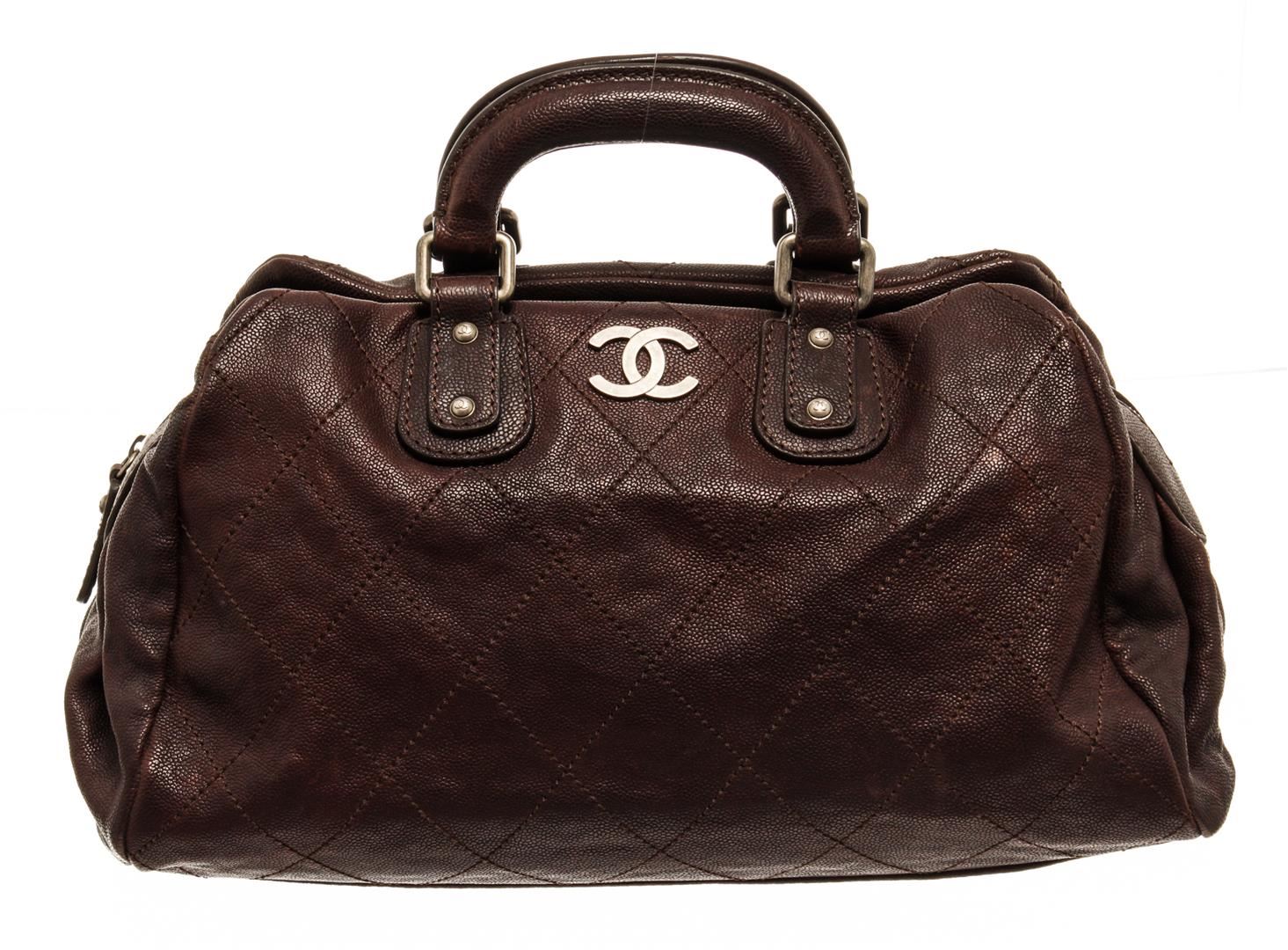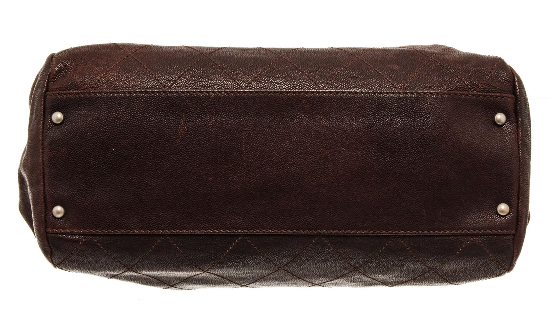 One Chanel Brown Leather CC Handbag. Item is sold AS-IS. All available information is listed in the description and shown in the photo. Chanel brown leather CC handbag features a diamond pattern stitched brown leather exterior, black fabric lining, silver-tone hardware, zipper closure, top handles, and one interior zip pocket. Length: 16.00 in, Width: 7.00 in, Height: 9.00 in, Drop: 4.00 in/ 40.64 x 17.78 x 22.8 Cm