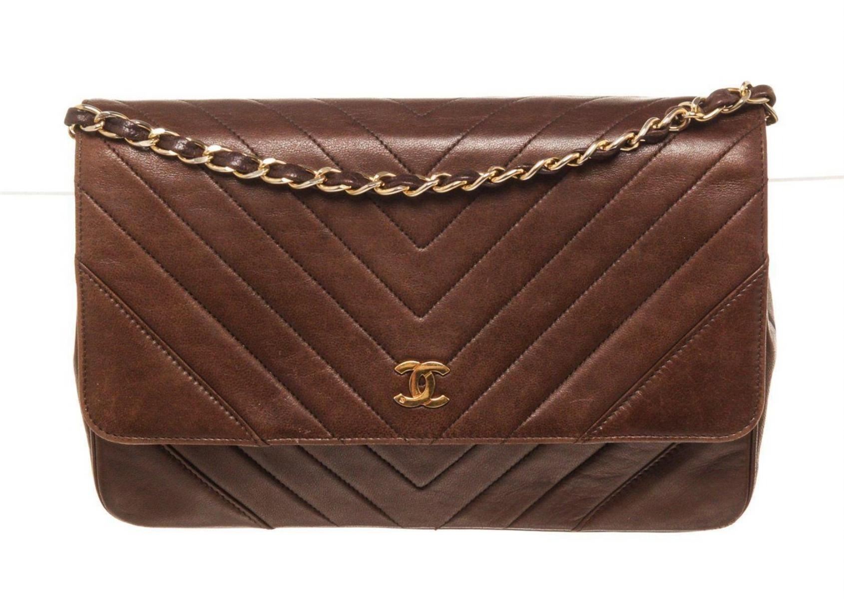 Chanel Brown Leather Chevron Sinlge Flap Shoulder Bag with gold-tone hardware, convertible chain-link and leather shoulder strap, single patch pocket at back, single zip pocket at flap underside, three compartments; two with snap closure at flap, tonal leather lining, dual slit pockets at interior wall and CC turn-lock closure at front flap.