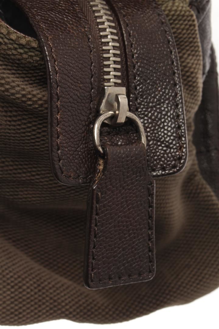 One Chanel Brown Leather Green Canvas Large wild Stitch Bag. Item is sold AS-IS. All available information is listed in the description and shown in the photo. chanel brown leather green canvas large wild stitch bag with caviar leather & quilted pattern, antiqued silver-tone hardware, flat handles, dual exterior pockets, canvas lining & three interior pockets, zip closure at top. Height: 9", Width: 14.75", Depth: 5" / 22.86 x 37.46 x 12.7 cm