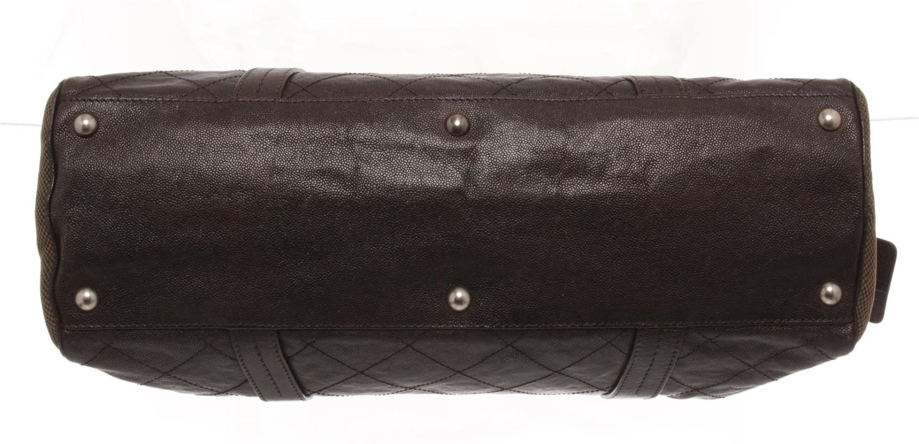 One Chanel Brown Leather Green Canvas Large wild Stitch Bag. Item is sold AS-IS. All available information is listed in the description and shown in the photo. chanel brown leather green canvas large wild stitch bag with caviar leather & quilted pattern, antiqued silver-tone hardware, flat handles, dual exterior pockets, canvas lining & three interior pockets, zip closure at top. Height: 9", Width: 14.75", Depth: 5" / 22.86 x 37.46 x 12.7 cm