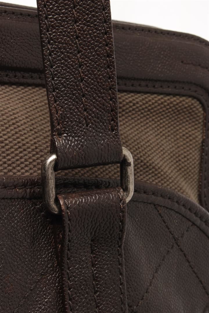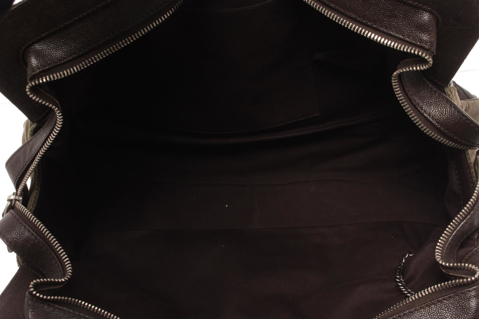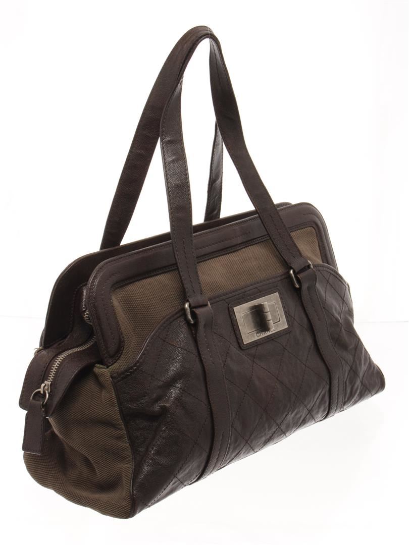One Chanel Brown Leather Green Canvas Large wild Stitch Bag. Item is sold AS-IS. All available information is listed in the description and shown in the photo. chanel brown leather green canvas large wild stitch bag with caviar leather & quilted pattern, antiqued silver-tone hardware, flat handles, dual exterior pockets, canvas lining & three interior pockets, zip closure at top. Height: 9", Width: 14.75", Depth: 5" / 22.86 x 37.46 x 12.7 cm