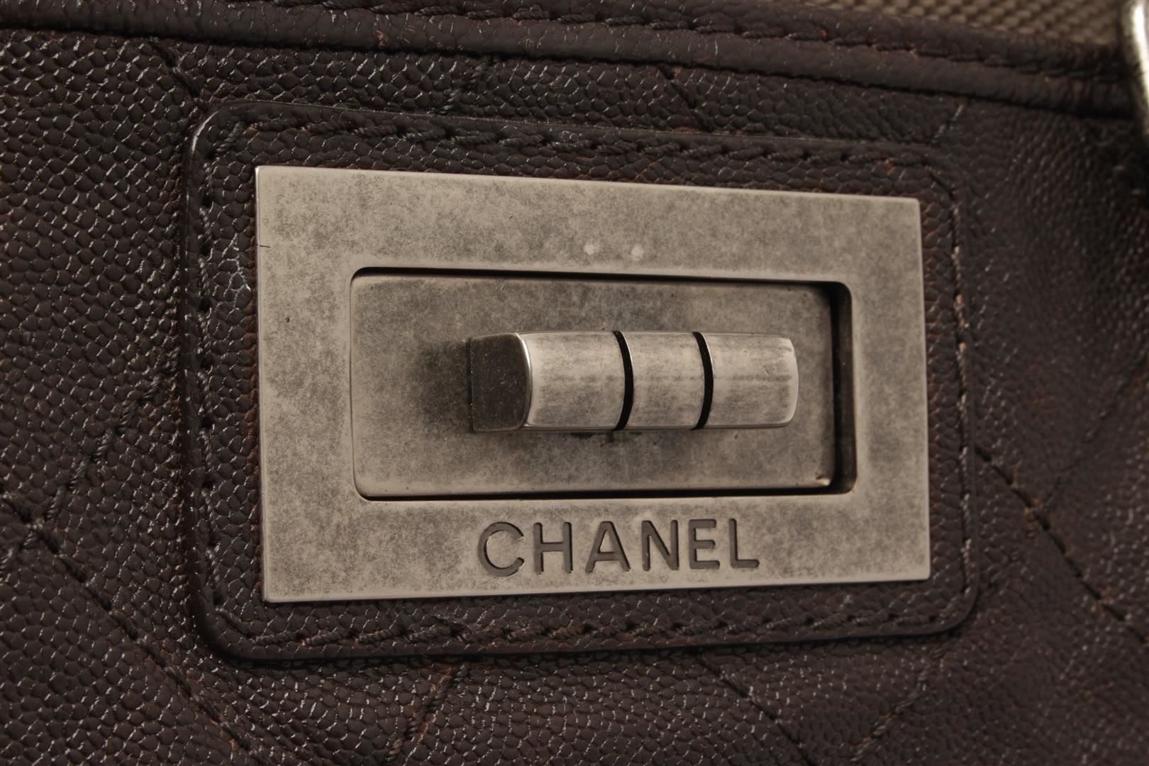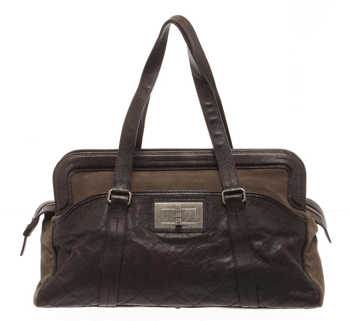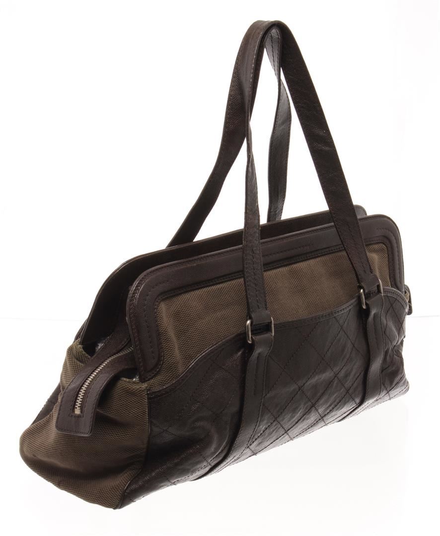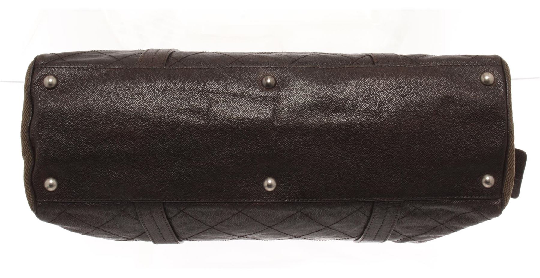 One Chanel Brown Leather Green Canvas Large wild Stitch Bag. Item is sold AS-IS. All available information is listed in the description and shown in the photo. chanel brown leather green canvas large wild stitch bag with caviar leather & quilted pattern, antiqued silver-tone hardware, flat handles, dual exterior pockets, canvas lining & three interior pockets, zip closure at top. Height: 9", Width: 14.75", Depth: 5" / 22.86 x 37.46 x 12.7 cm