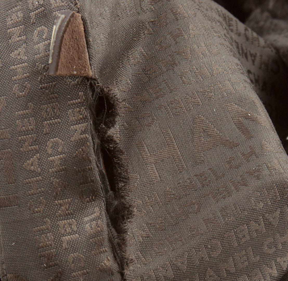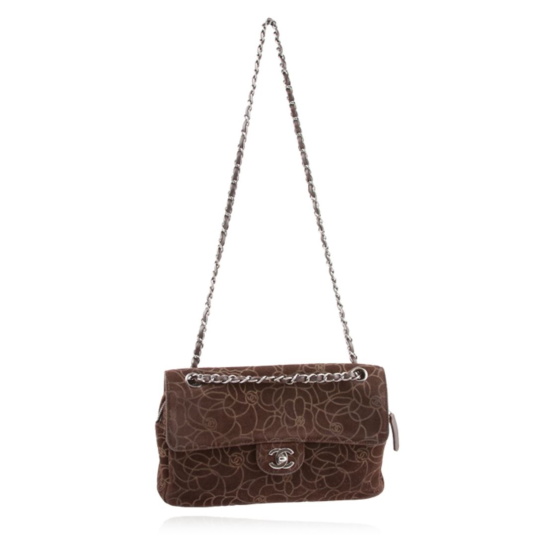 One Chanel maxi flap bag featuring: brown suede, flower print and measures 11.5" x 2.5" x 7". There is a small rip on the inside of the purse.
