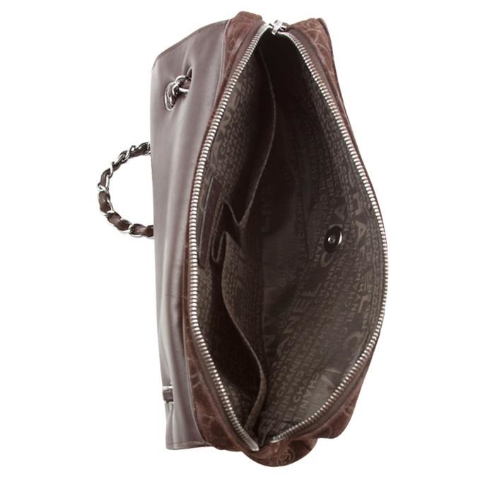 One Chanel maxi flap bag featuring: brown suede, flower print and measures 11.5" x 2.5" x 7". There is a small rip on the inside of the purse.