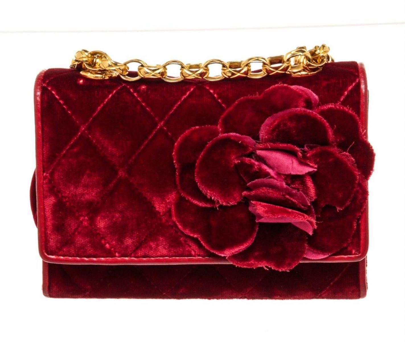 Chanel Burgundy Velvet Mini Camelia Flap Shoulder Bag with gold-tone hardware, interior zip pockets, chain shoulder strap and snap closure.
