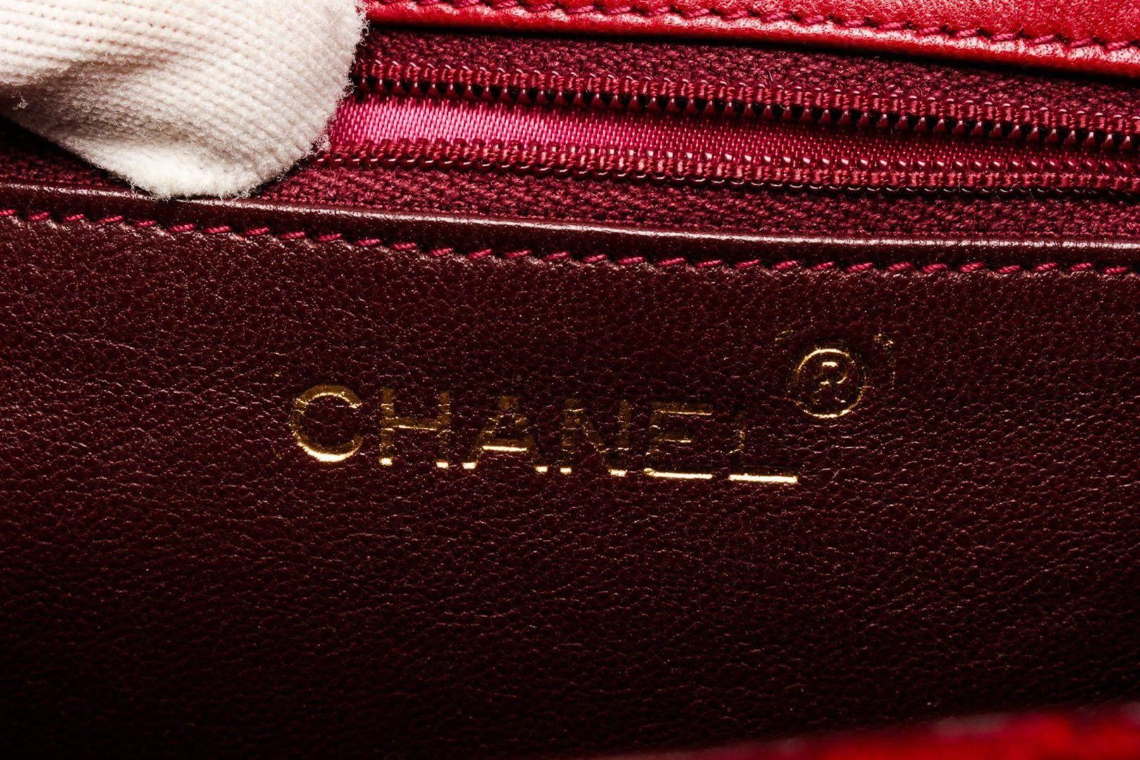 Chanel Burgundy Velvet Mini Camelia Flap Shoulder Bag with gold-tone hardware, interior zip pockets, chain shoulder strap and snap closure.