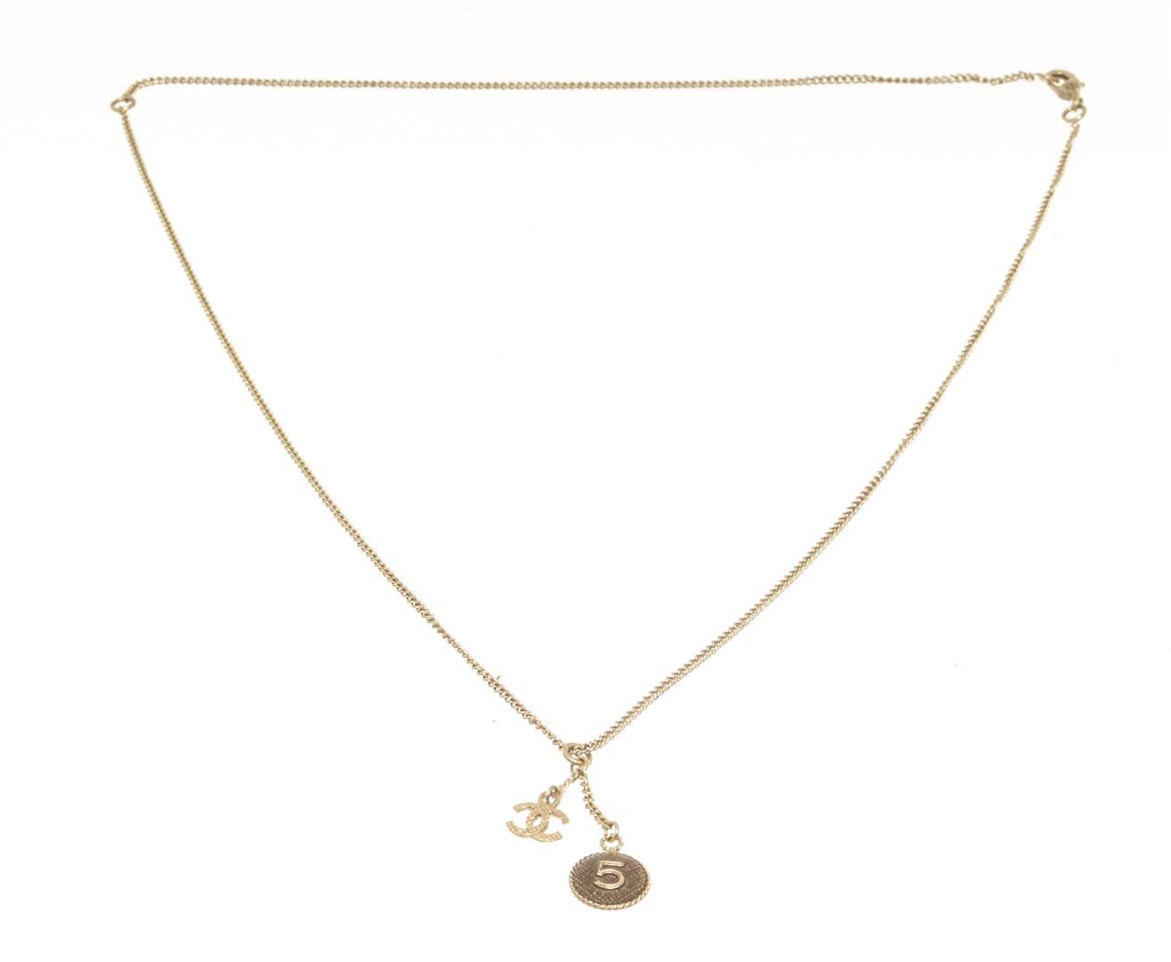 Chanel CC #5 Necklace Necklace Gold Metal. Brand: Chanel, Style: CC #5 Necklace, Type: Necklace, Exterior Color: Gold, Exterior Material: Metal, Closure: Lobster Closure, Width: 1, Height: 1, Handle Drop: 1, Strap Drop: 13. Item is sold AS-IS and all information pertaining to this lot is available in the photos or this description.