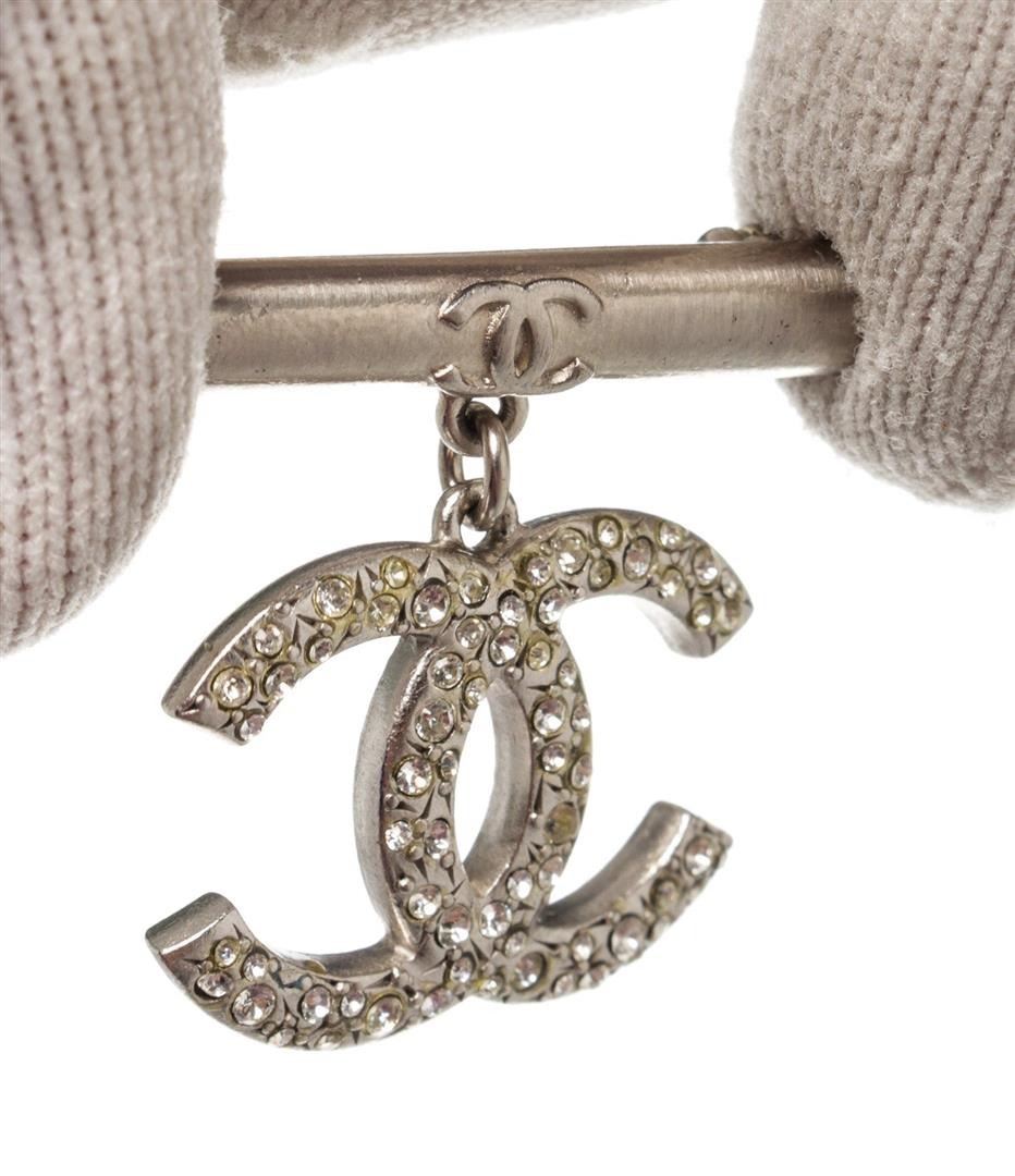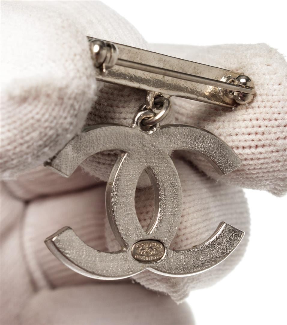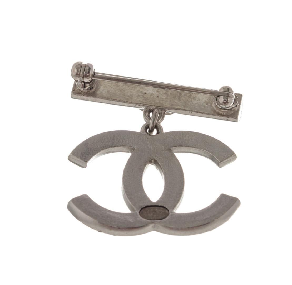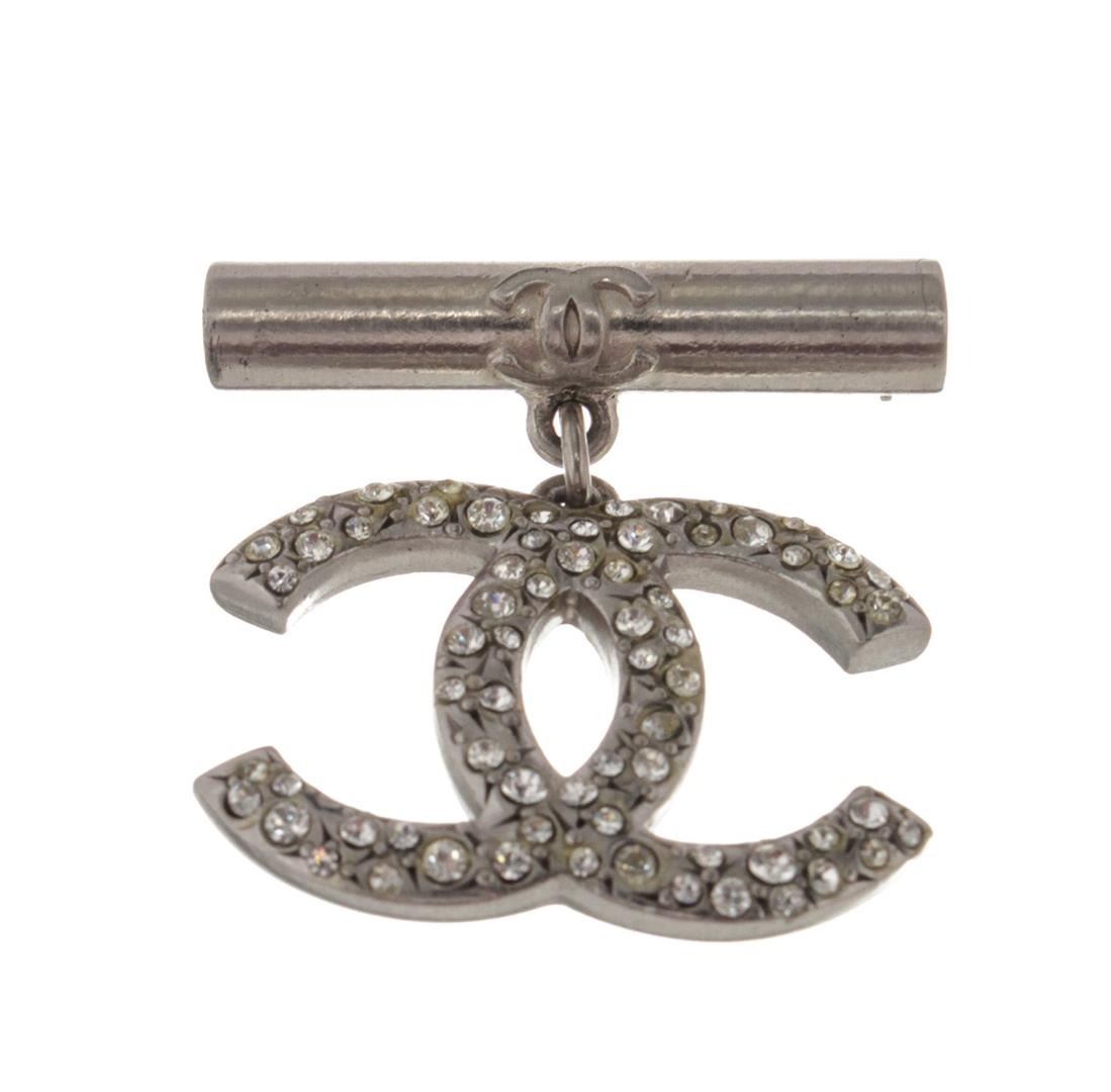 Silver-tone Chanel CC brooch features rhinestones on CC logo and silver-tone hardware.