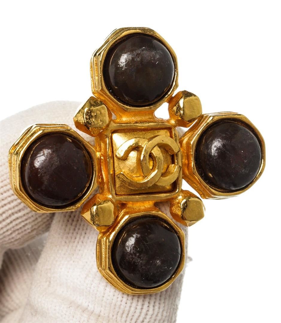 Gold-tone cross shape Chanel CC brooch with CC logo at the center and gold-tone hardware.