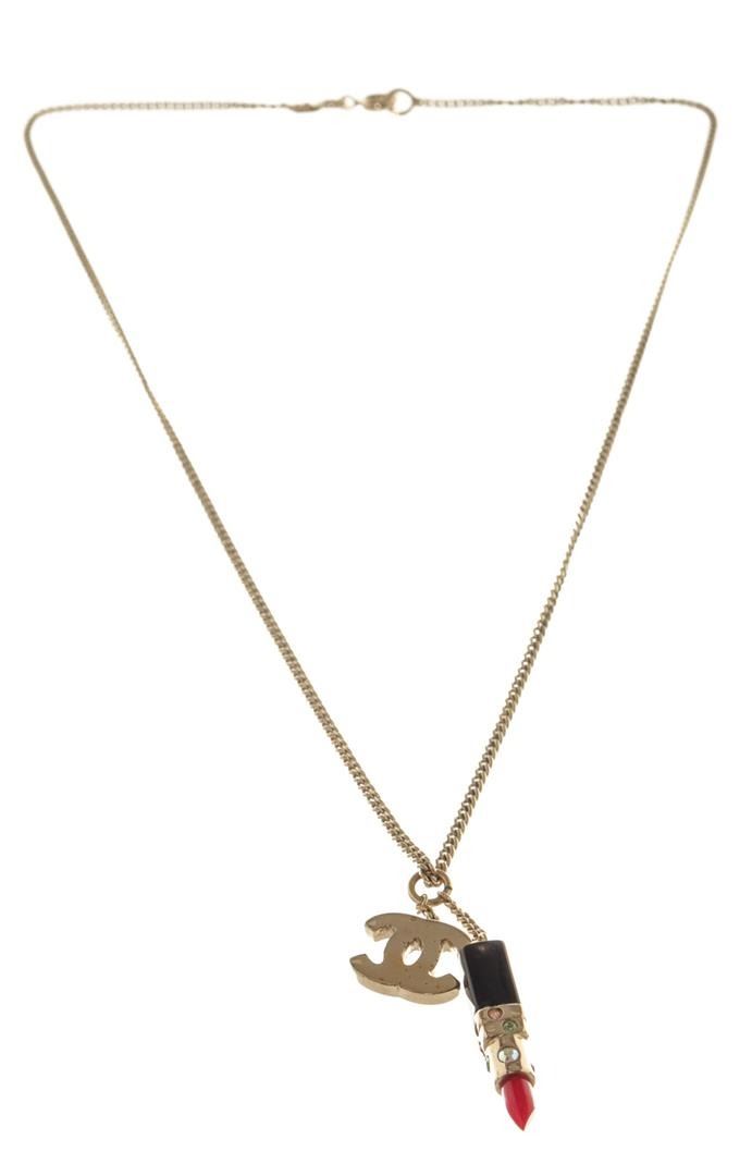 Chanel CC Lipstick Pendant Necklace Gold Black Red Metal, Enamel. Brand: Chanel, Style: CC Lipstick Pendant, Type: Necklace, Exterior Color: Gold Black Red, Exterior Material: Metal, EN/Amel, Closure: Springring Clasp.5, Height: 1.5, Strap Drop: 8. Item is sold AS-IS and all information pertaining to this lot is available in the photos or this description.