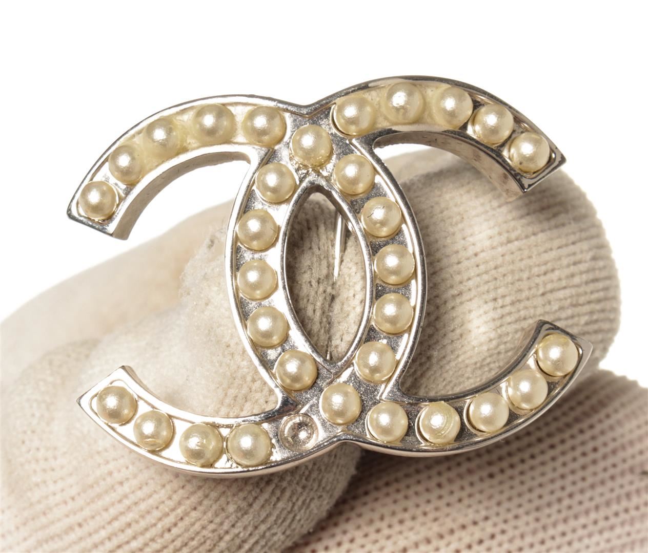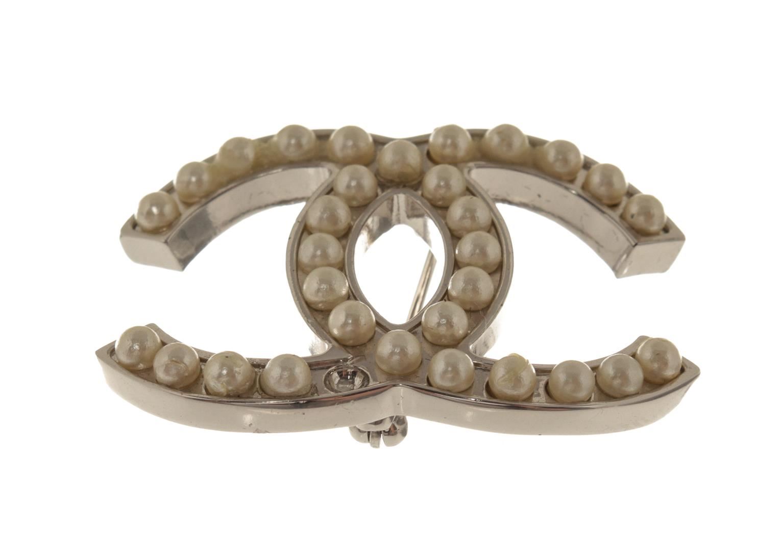 Chanel CC Pearl Brooch. All available information is listed in the description and shown in the photos. Chanel CC Pearl Brooch with faux pearls and silver tone metal hardware.