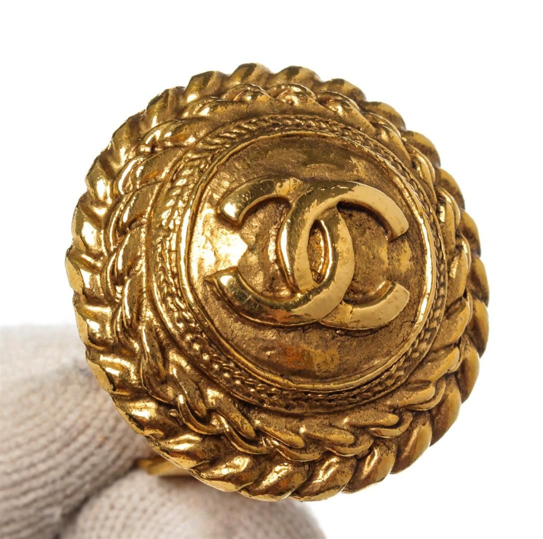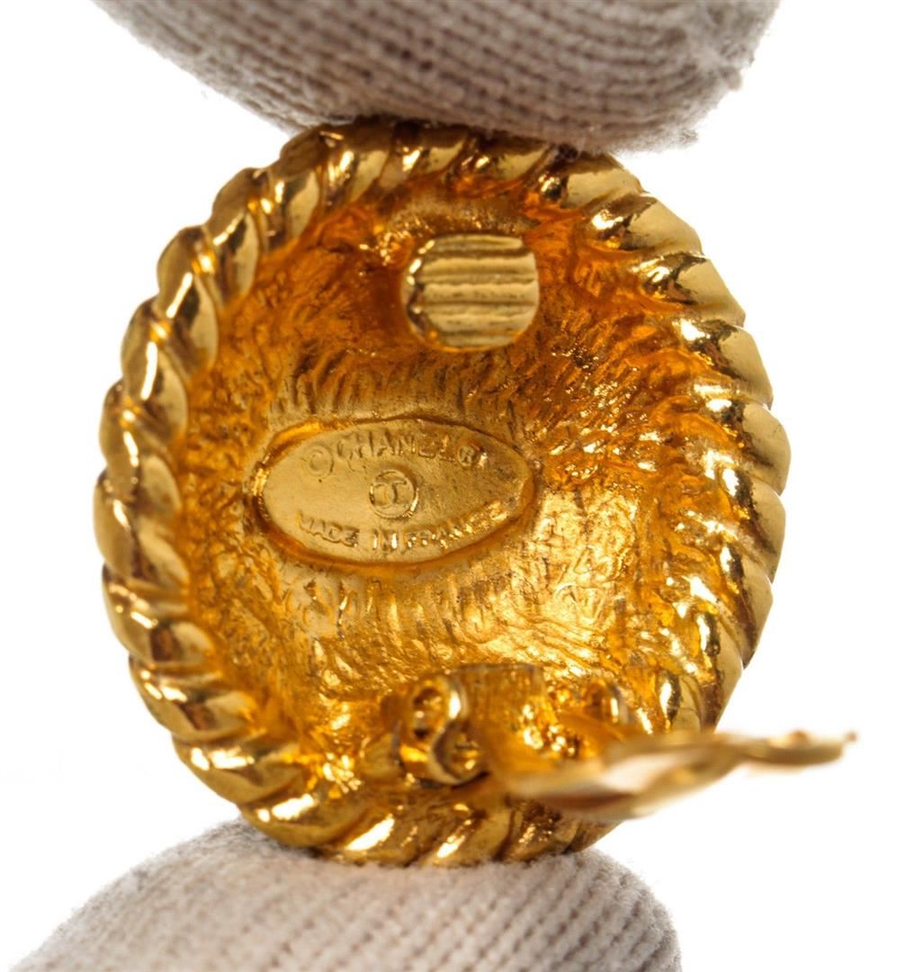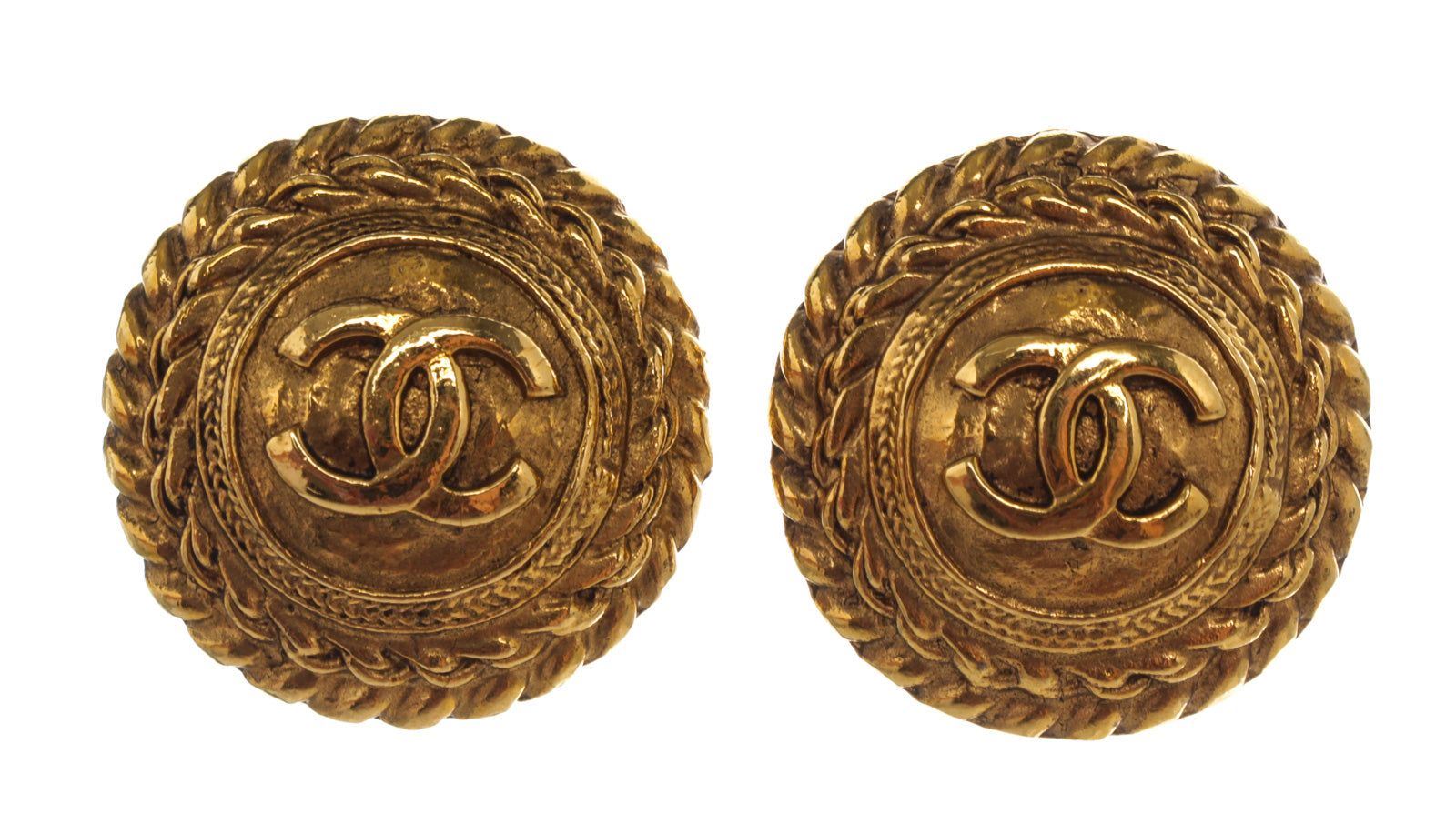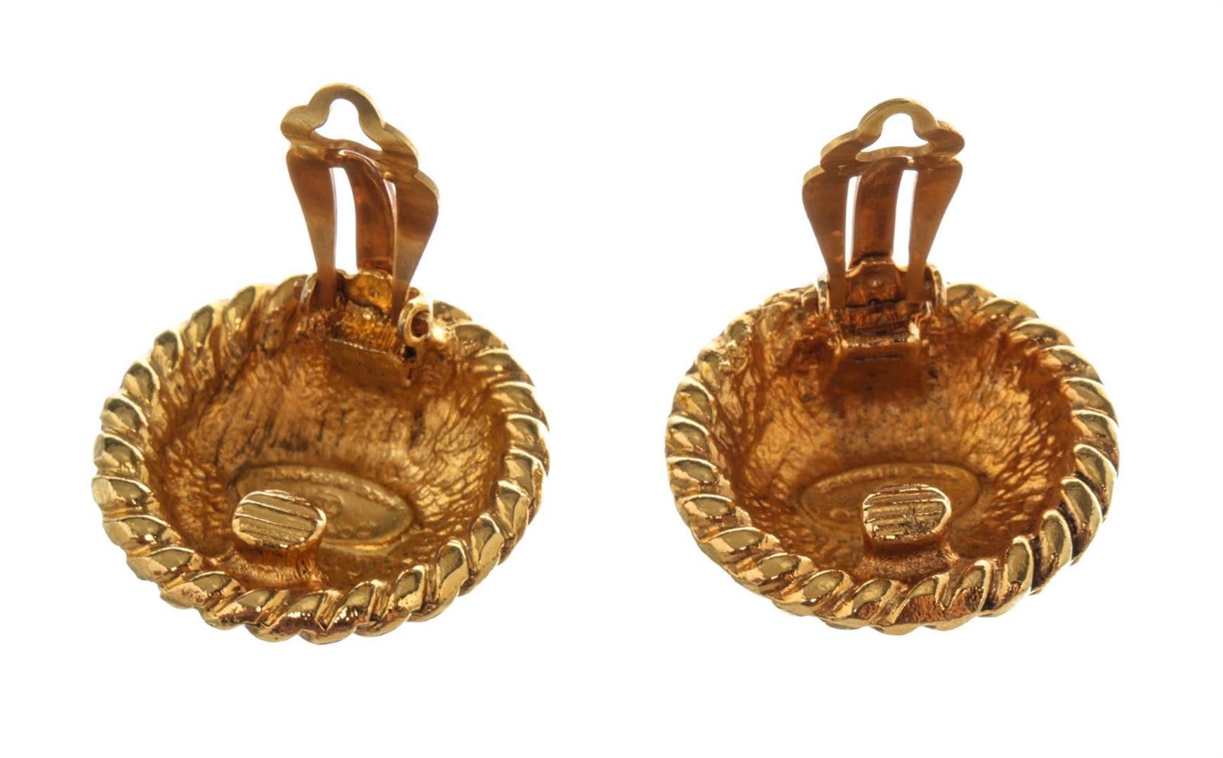 Round metal vintage Chanel earrings features gold-tone color with interlocking CC in the center, clip on closure with gold-tone hardware.