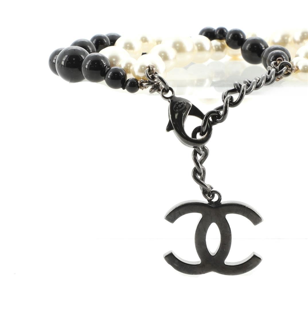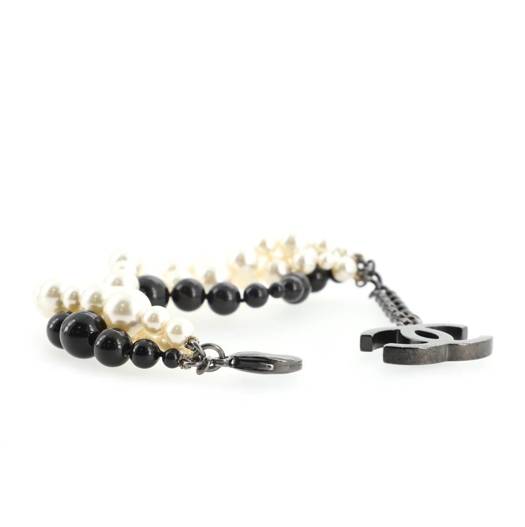 Chanel CC Triple Strand Bracelet Faux Pearls and Metal Black Metal Faux Pearl Condition Details: Scratches and wear throughout, moderate scratches and discoloration on hardware. Height 7", Width 1", Depth ", Strap Drop -