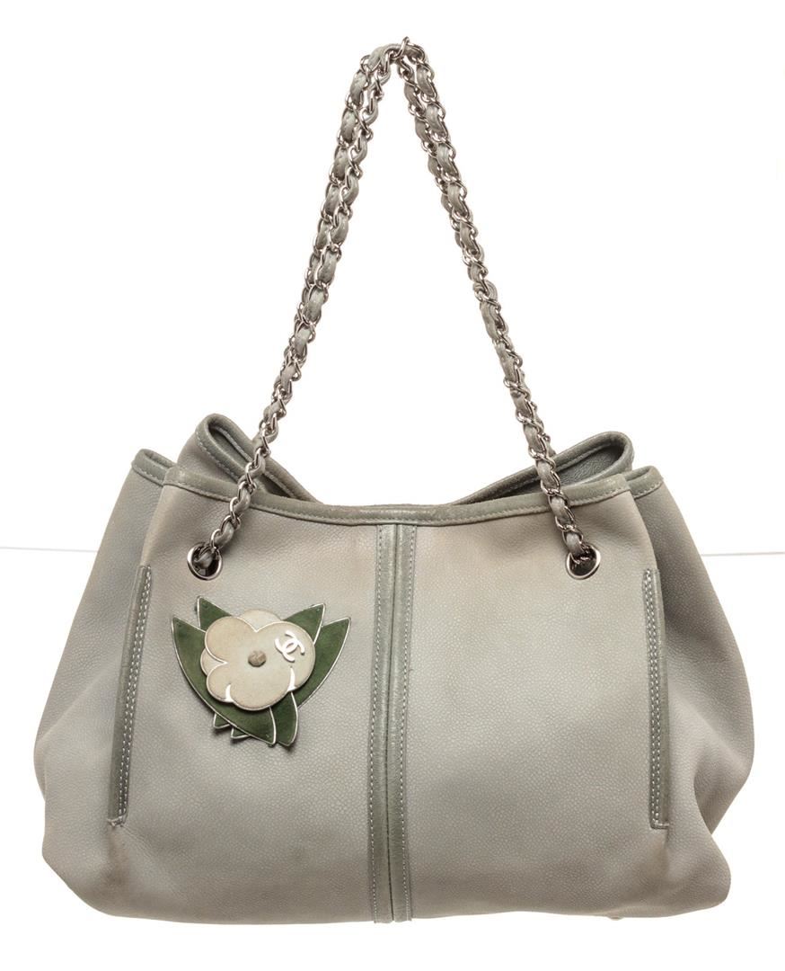 Chanel Camellia Patch Chain Tote Green Nubuck. Brand: Chanel, Style: Camellia Patch Chain, Type: Tote, Exterior Color: Green, Exterior Material: Nubuck, Exterior Pockets: None, Interior Color: Green, Interior Material: Leater, Interior Pockets: None, Closure: None, Handle/Strap Type: Chain strap, Length: 13 5/8", Width: 9 1/2", Height: 8 1/2", Handle Drop: 1N/A". Condition: Exterior leather is worn and discolored. Item is sold AS-IS and all information pertaining to this lot is available in the photos or this description.