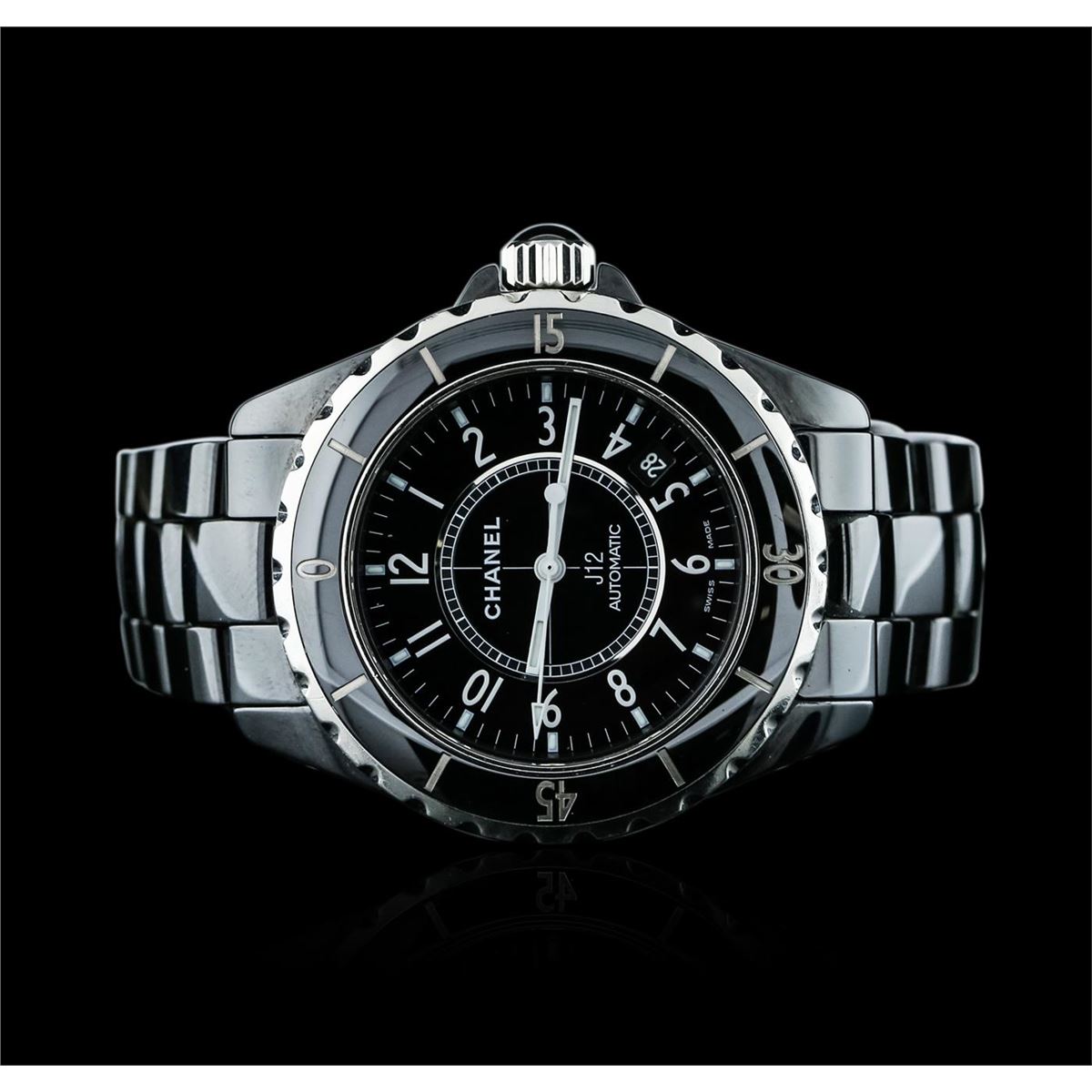 One, Chanel J12 Ceramic wristwatch, Case: 38mm, Case Back: secured by eight set screws, engraved with the manufacturers name and ID numbers, Crown: locking, set within protective shoulders, Bezel: unidirectional rotating Black Ceramic, with indices and numerals. Movement: Swiss automatic, Dial: Black, with luminous hands, luminous indices and numerals, Date Window: between the 4 o'clock and 5 o'clock position, Bracelet: Black Ceramic, Condition: G-5 Fine. Three removable links. Seven inch length. Concealed deployment clasp. Total Weight of Watch 135.23 grams. AIG Appraised at $4,990.00.