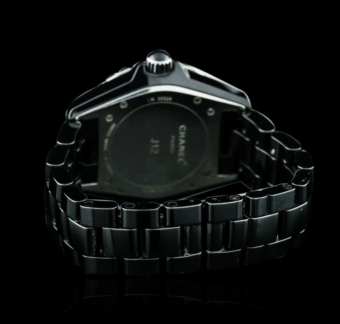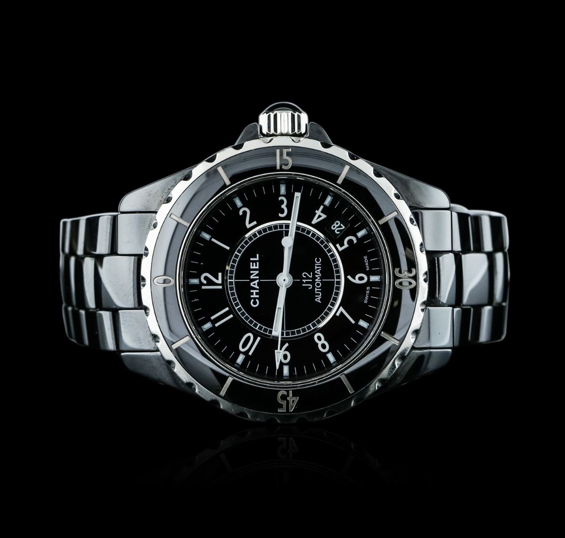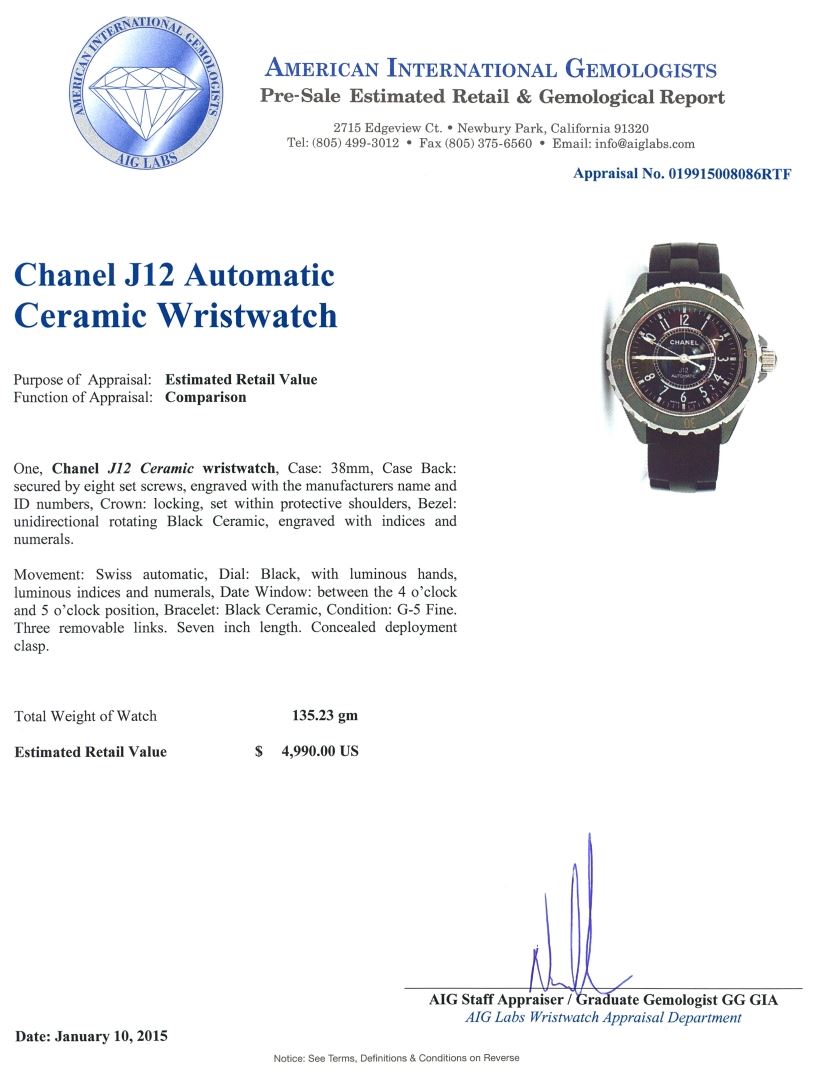 One, Chanel J12 Ceramic wristwatch, Case: 38mm, Case Back: secured by eight set screws, engraved with the manufacturers name and ID numbers, Crown: locking, set within protective shoulders, Bezel: unidirectional rotating Black Ceramic, with indices and numerals. Movement: Swiss automatic, Dial: Black, with luminous hands, luminous indices and numerals, Date Window: between the 4 o'clock and 5 o'clock position, Bracelet: Black Ceramic, Condition: G-5 Fine. Three removable links. Seven inch length. Concealed deployment clasp. Total Weight of Watch 135.23 grams. AIG Appraised at $4,990.00.