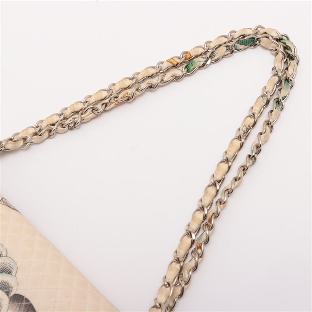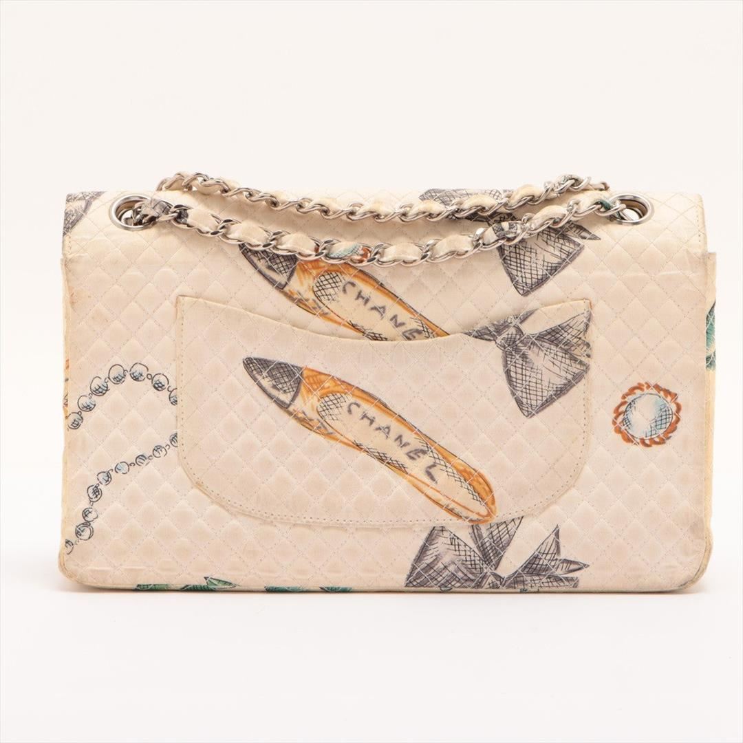 One Chanel Classic Beige Multicolor Quilted Canvas Flower Art Print Single Flap Shoulder Bag. Item is sold AS-IS. All available information is listed in the description and shown in the photo. Chanel Classic flap bag features diamond quilted canvas in beige with drawings of some Chanel icons (CC logo, Camelia flowers, bows, pearl necklaces, quilted bags and shoes), silver-tone hardware, CC turn-lock at front, interlaced chain with canvas shoulder strap and an open pocket on the back side of the bag. The interior of the bag is made from white leather with one slip pocket and one pocket that closes with a zipper. 10"L x 2.5"W x 6.5"H