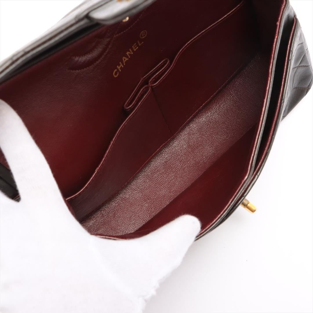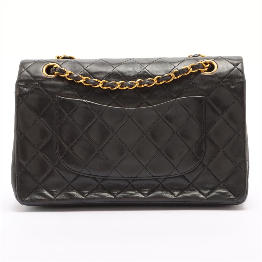 Chanel Classic Double Flap shoulder bag features black diamond-quilted Lambskin leather with back pocket, gold-tone hardware, interlocking CC turn-lock closure, intertwined leather and chain shoulder strap, red leather lining with embossed CC logo at the