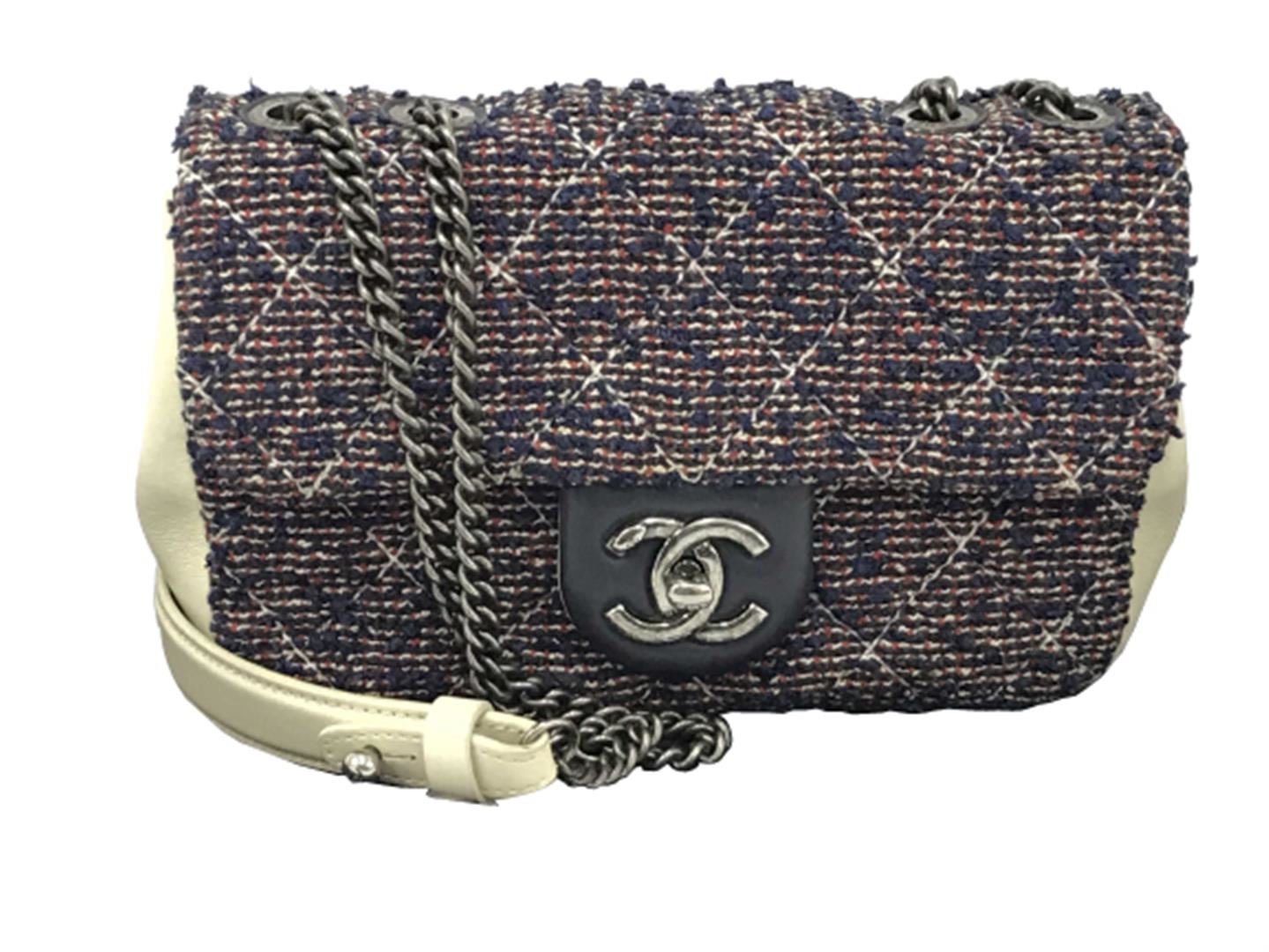 One Chanel Classic Black Red Quilted Tweed Leather CC Single Flap Shoulder Bag. Item is sold AS-IS. Please check photos and descriptions for all available details. Red, blue and white quilted tweed Chanel Flap shoulder bag with silver-tone hardware, white leather trim, chain-link long shoulder strap with white leather pad, interlocking CC turn-lock at front flap that will open to white canvas-lined interior with one zipped pocket inside. Height: 8.5 in Width: 3.5 Base Length: 11.5 in