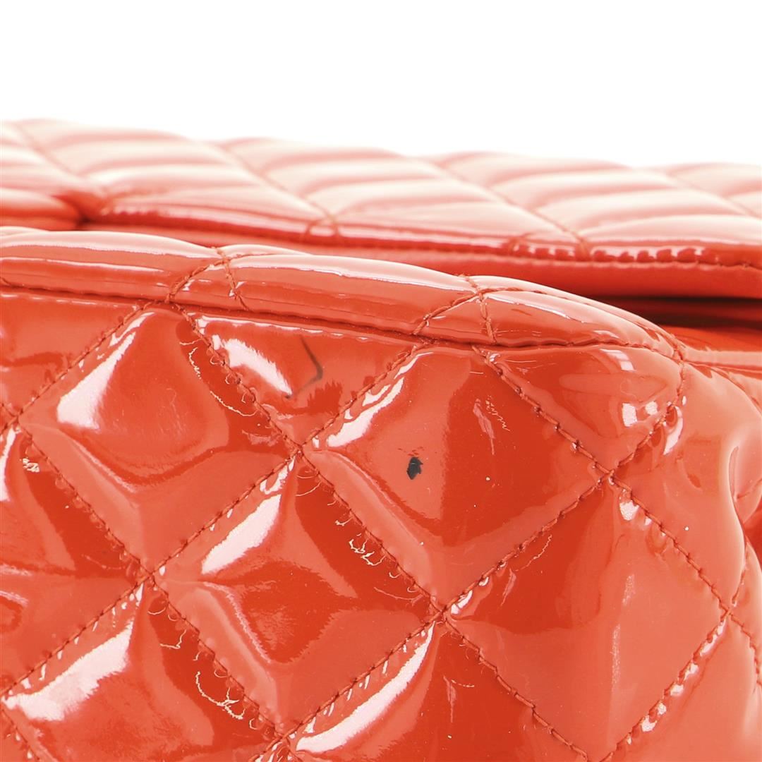 Chanel Classic Double Flap Bag Quilted Patent Medium. All available information is listed in the description and shown in the photos. Chanel Classic Double Flap Bag Quilted Patent Medium. Light scuffs on exterior, minor creasing on front, underneath flap and in interior, slight darkening on rear pocket edge. Pen mark on base, indentations on interior flap, peeling on strap, scratches on hardware.