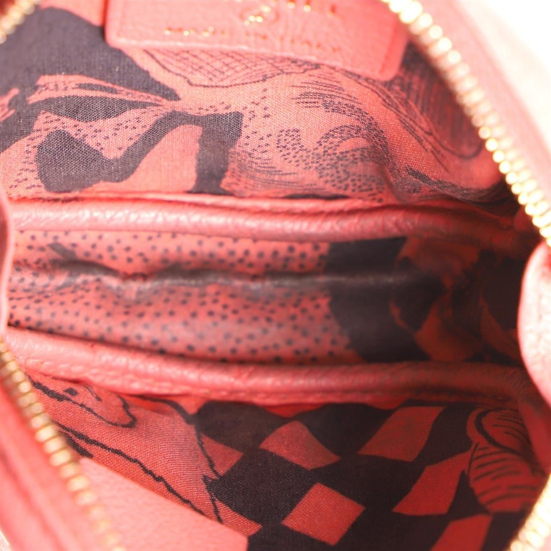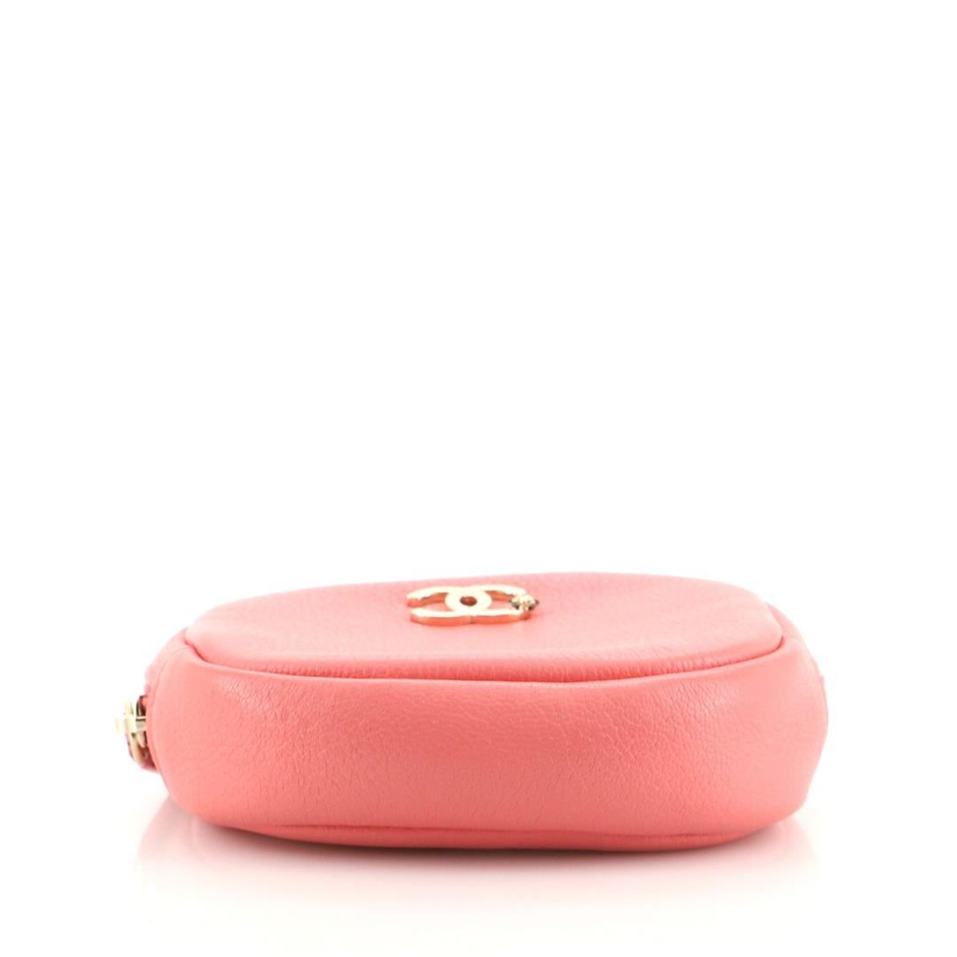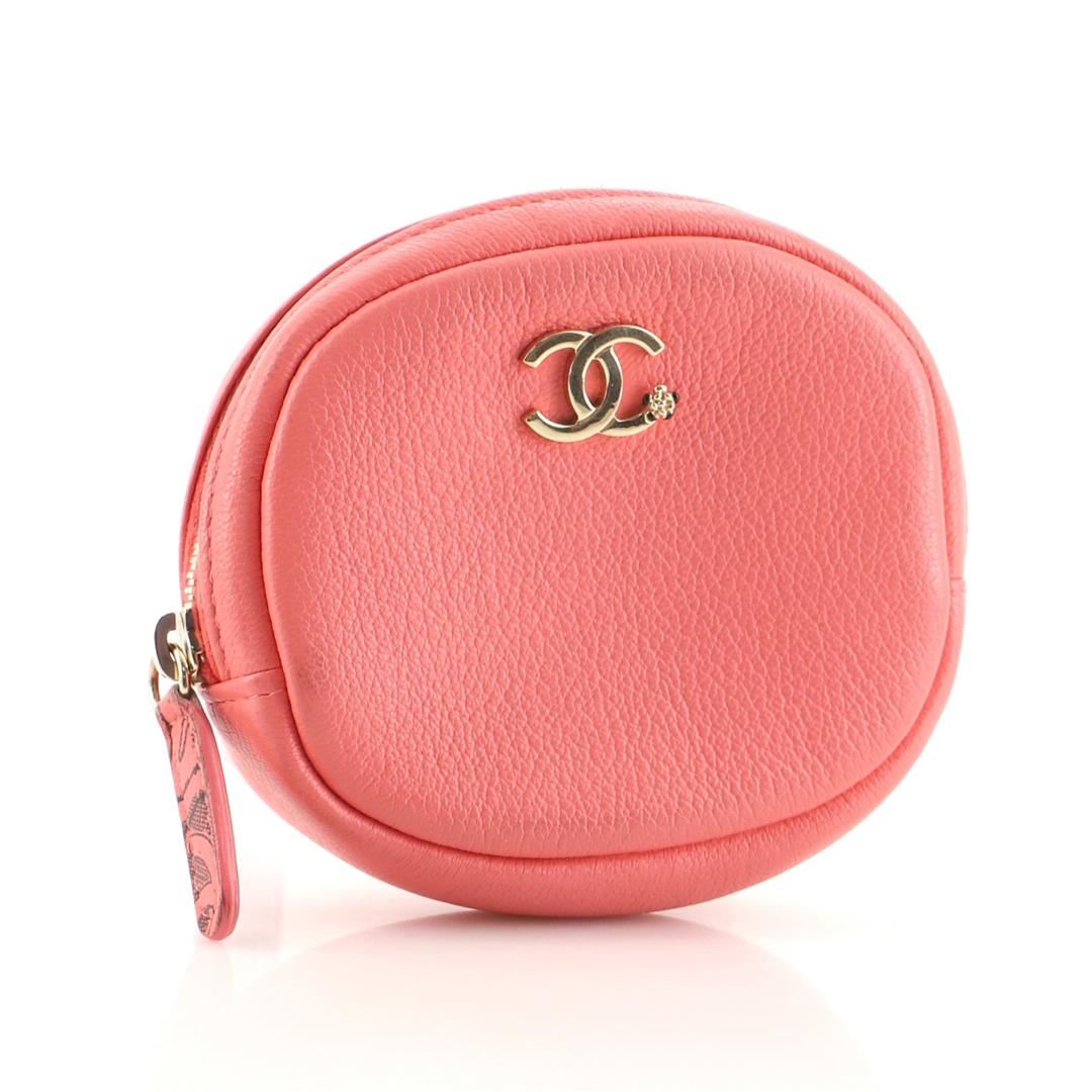 Chanel Classic Round Coin Purse Goatskin Pink Goatskin Condition Details: Odor in interior. Darkening, wear, small marks and creasing on exterior, peeling and splitting on zipper pull wax edges. Moderate darkening and wear in interior, scratches on ha