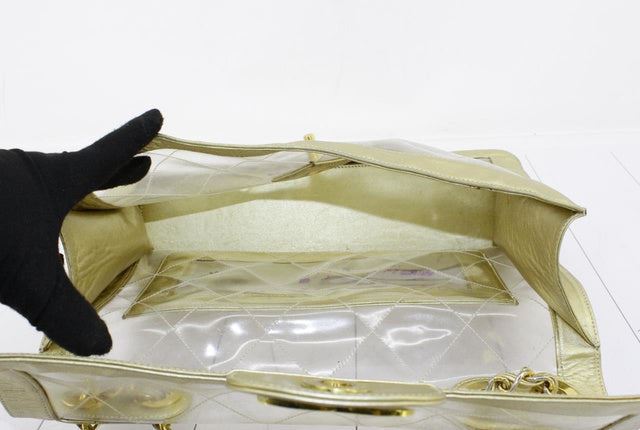 One Chanel Classic Vintage Naked Flap Quilted PVC with Gold Leather Maxi Flap Shoulder Bag. Item is sold AS-IS. All available information is listed in the description and shown in the photo. Clear quilted PVC Chanel Naked Maxi Flap shoulder bag with gold-tone hardware, gold lambskin leather trim, woven chain-link and leather long shoulder strap and interlocking CC turn-lock closure at the front flap. Handle Drop 12.5", Height 9", Width 12.5", Depth 3.5", Strap Drop 21.5"
