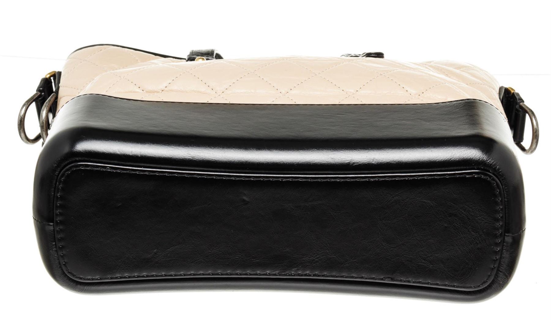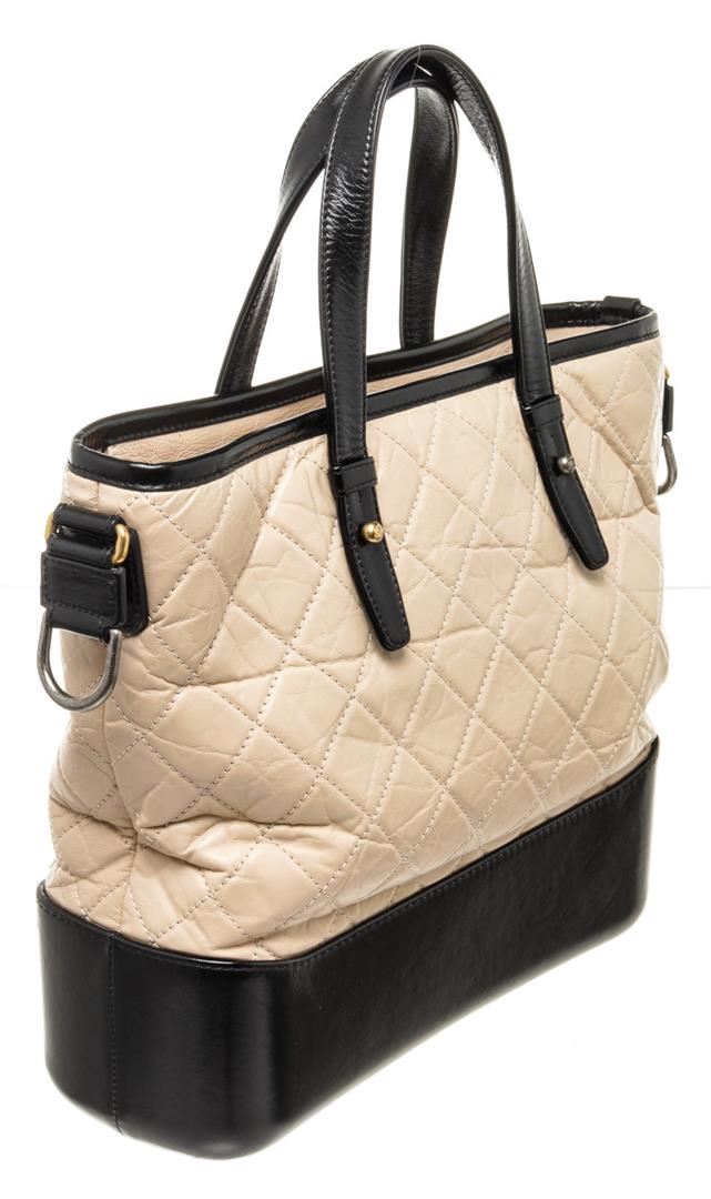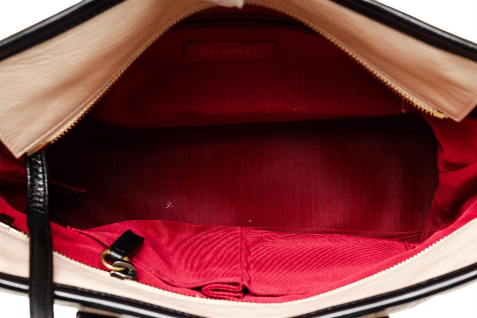 One Chanel Cream Black Leather Gabrielle Tote Bag. Item is sold AS-IS. All available information is listed in the description and shown in the photo. Chanel Cream Black Leather Gabrielle Tote Bag with leather, gold-tone hardware, trim leather, interior slip zip pocket, dual top handle and zipper closure.