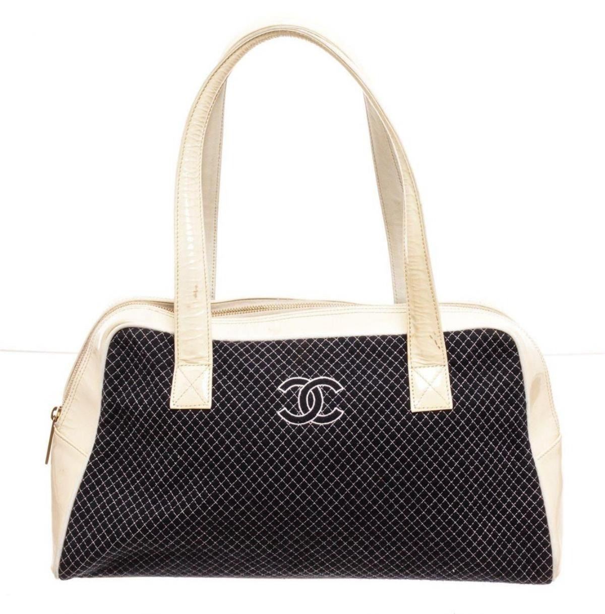 Chanel Cream Navy Blue Patent Trim Tote Bag. Chanel Cream Navy Blue Patent Trim Tote Bag with gold-tone hardware, shoulder strap and zipper closure. MEASUREMENTS: Length 4 in / 10 cm Width 14.5 in / 37 cm Height 8 in / 20 cmCONDITION: Pre-Owned Goo