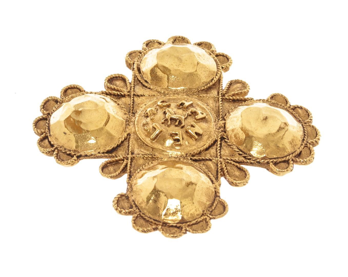 Chanel Cross Brooch Brooch Gold Plated Metal. Brand: Chanel, Style: Cross Brooch, Type: Brooch, Exterior Color: Gold Plated, Exterior Material: Metal, Closure: Pin Closure, Length: 2.5, Height: 2.5. Condition: Pin closure is broken. Item is sold AS-IS and all information pertaining to this lot is available in the photos or this description.