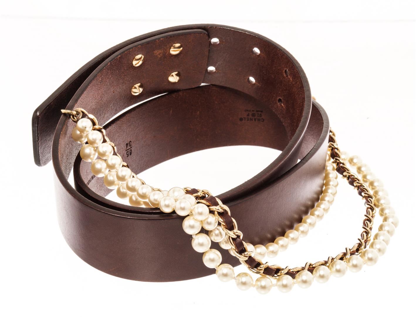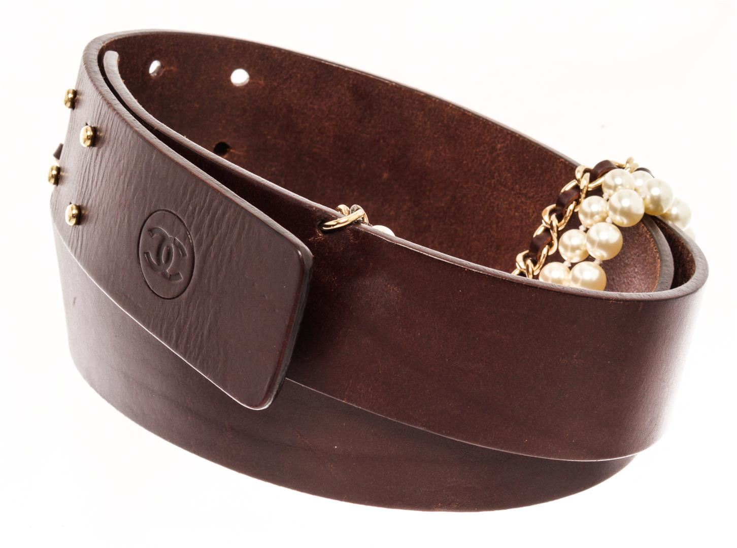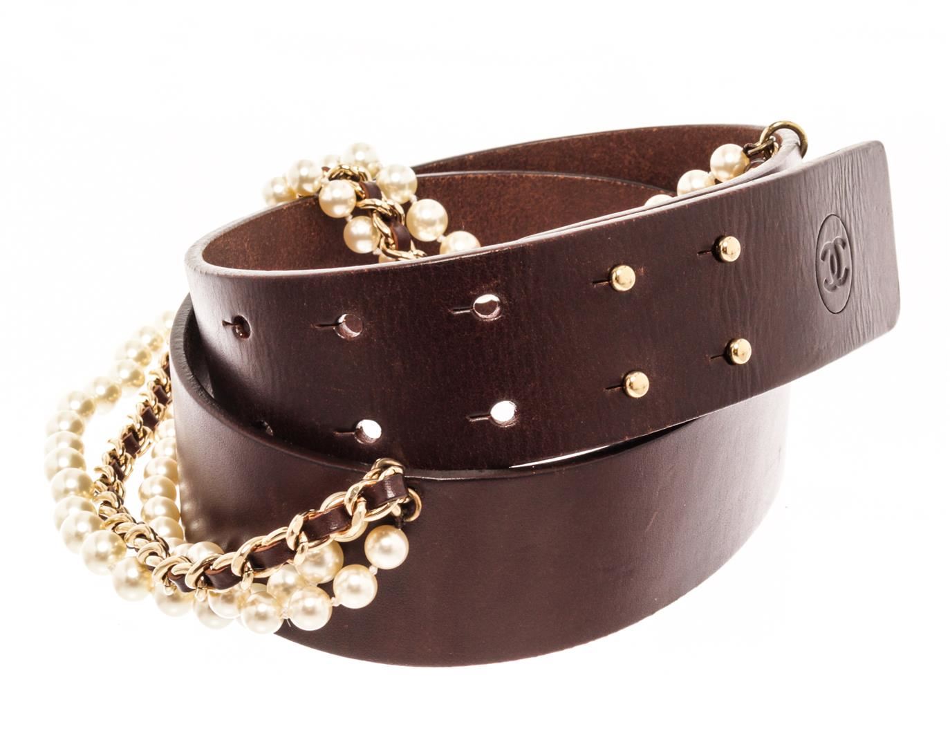 Chanel Dark Brown Gold Leather Pearl Belt. All available information is listed in the description and shown in the photos. Chanel Dark Brown Gold Leather Pearl Belt with brown calfskin pearl and gold leather chain belt with cc logo embossed. Length: 85.1 cm, Width: 3.8 cm / 33.50" x 1.49" Inches