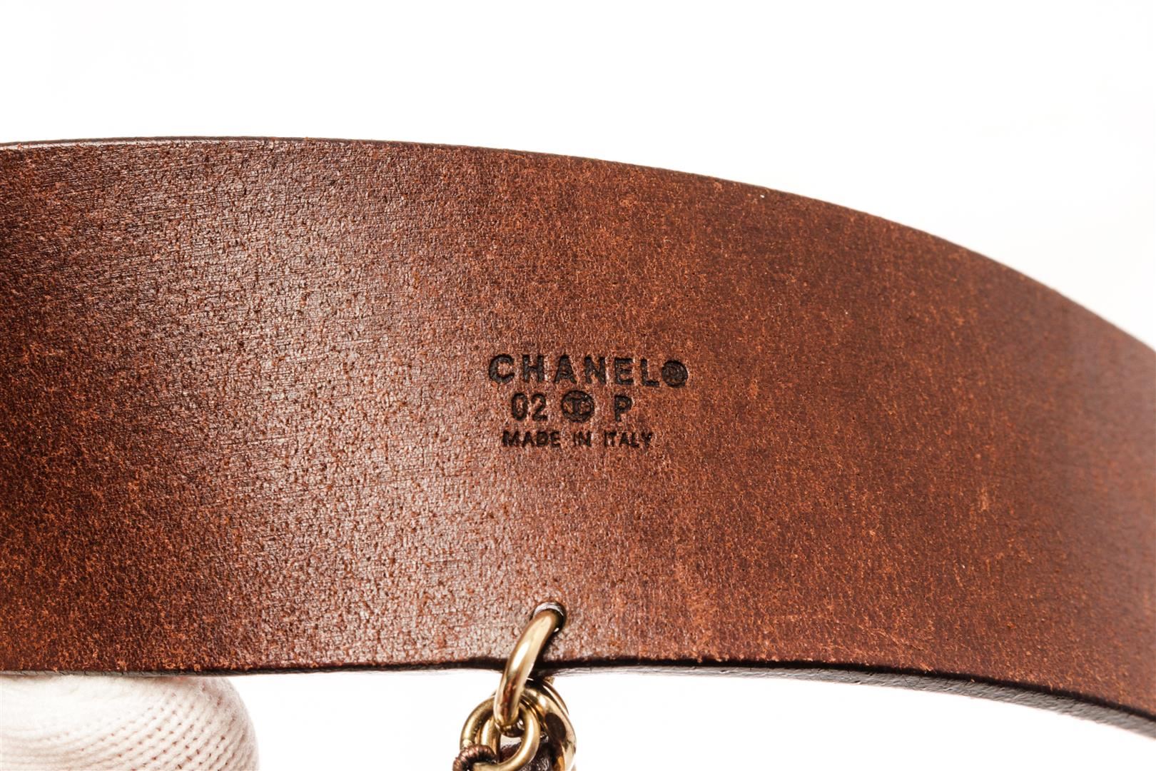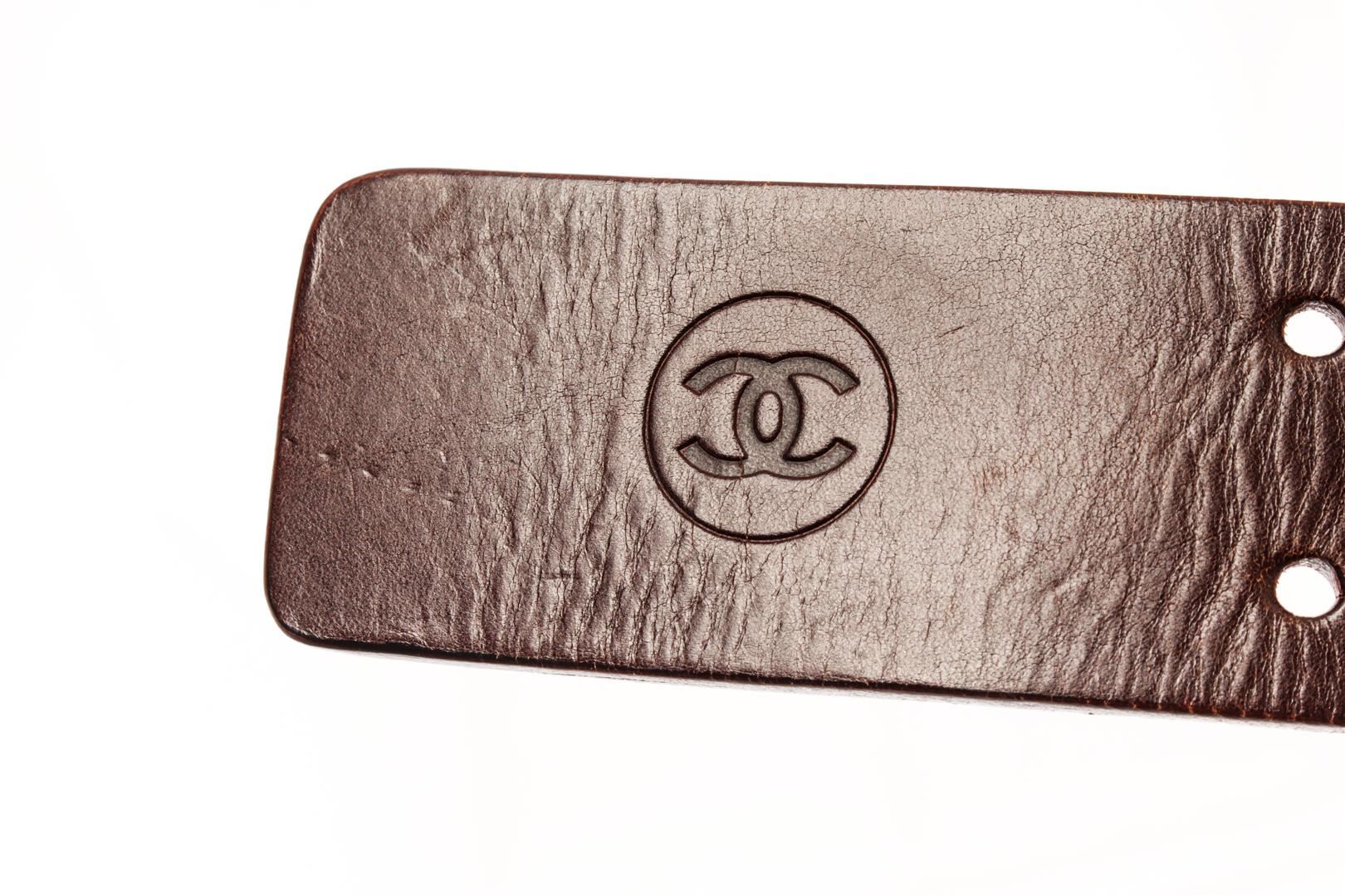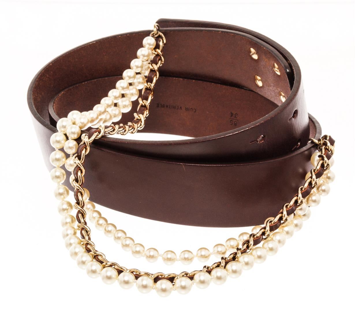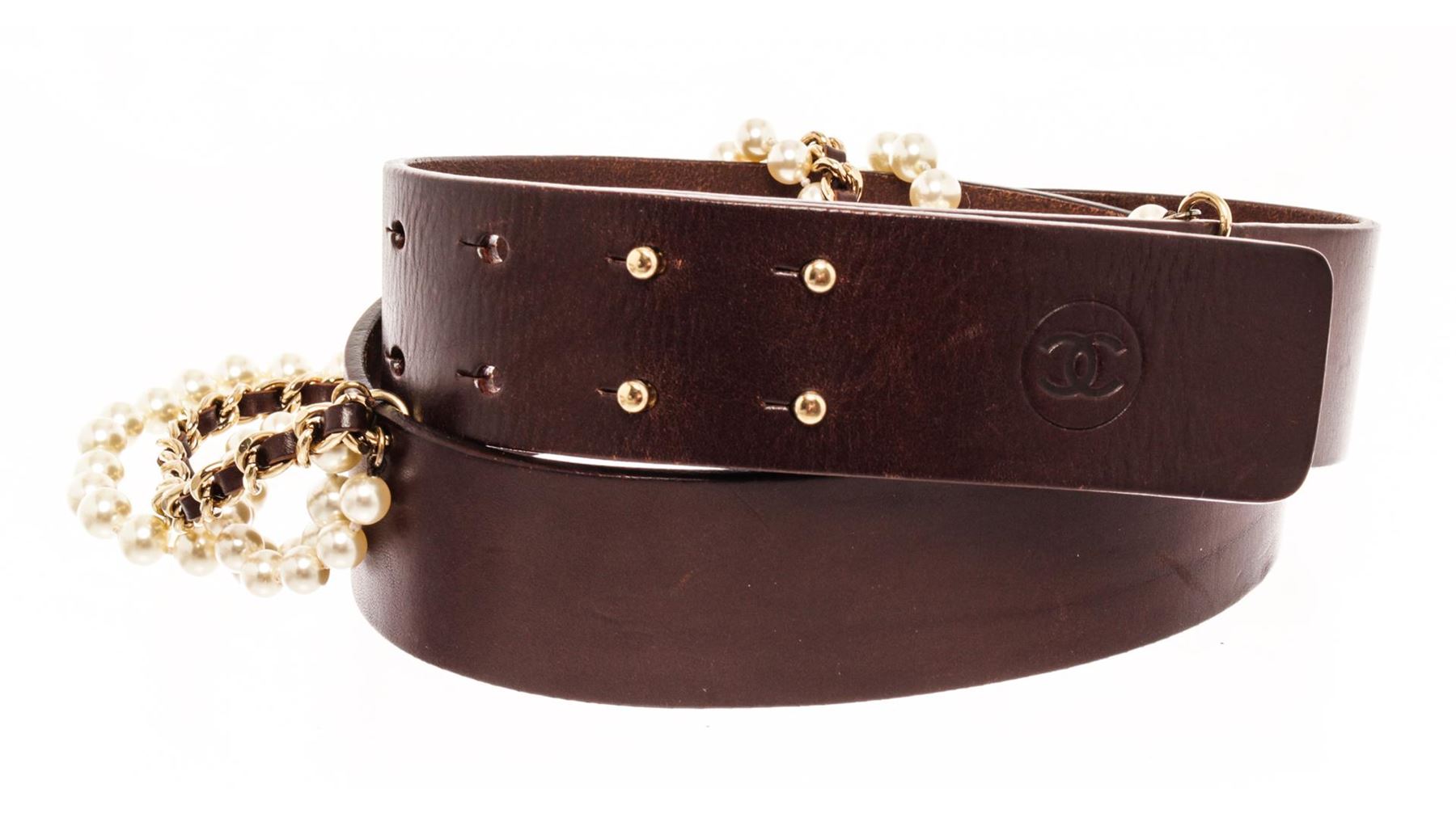 Chanel Dark Brown Gold Leather Pearl Belt. All available information is listed in the description and shown in the photos. Chanel Dark Brown Gold Leather Pearl Belt with brown calfskin pearl and gold leather chain belt with cc logo embossed. Length: 85.1 cm, Width: 3.8 cm / 33.50" x 1.49" Inches