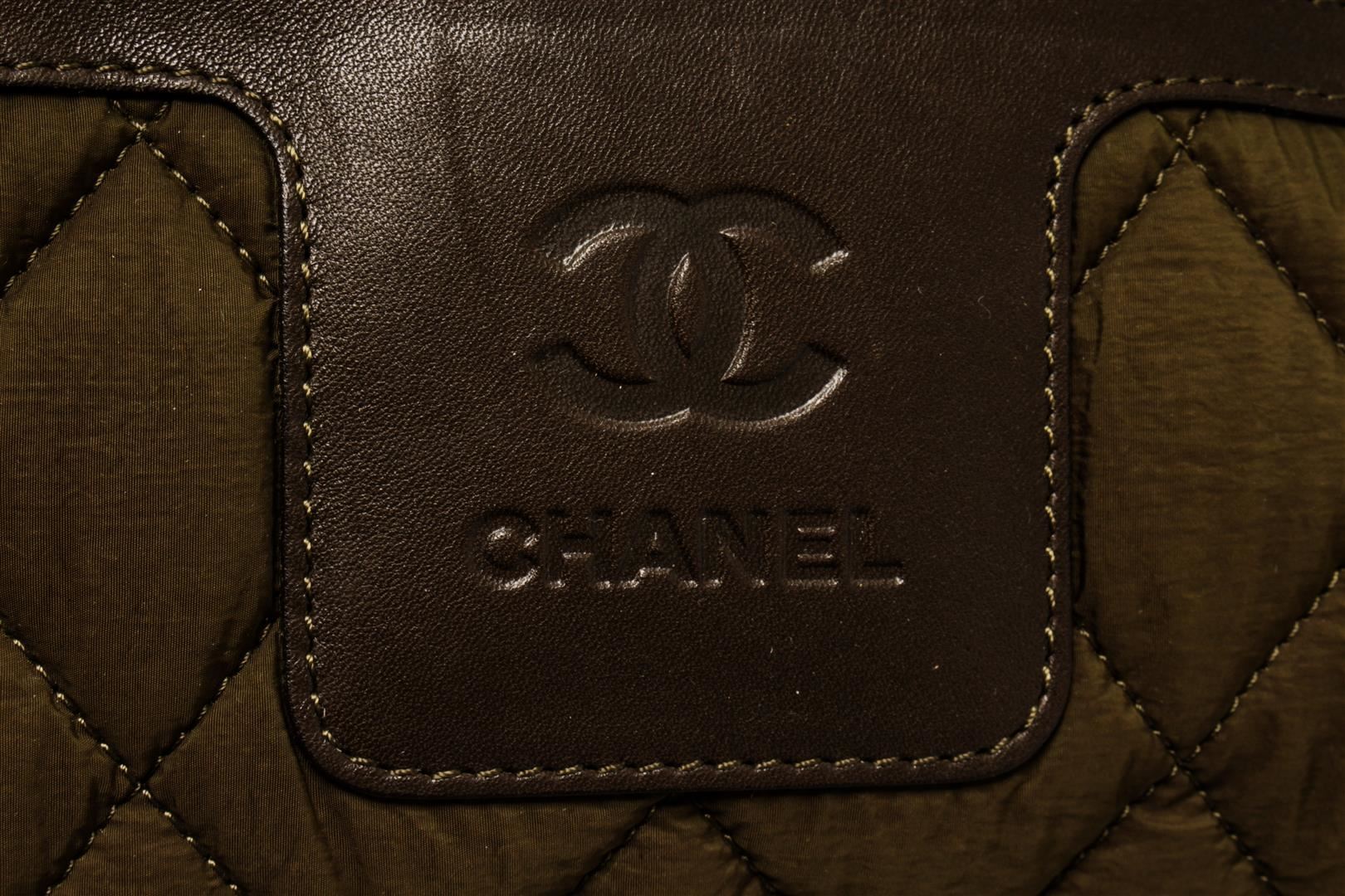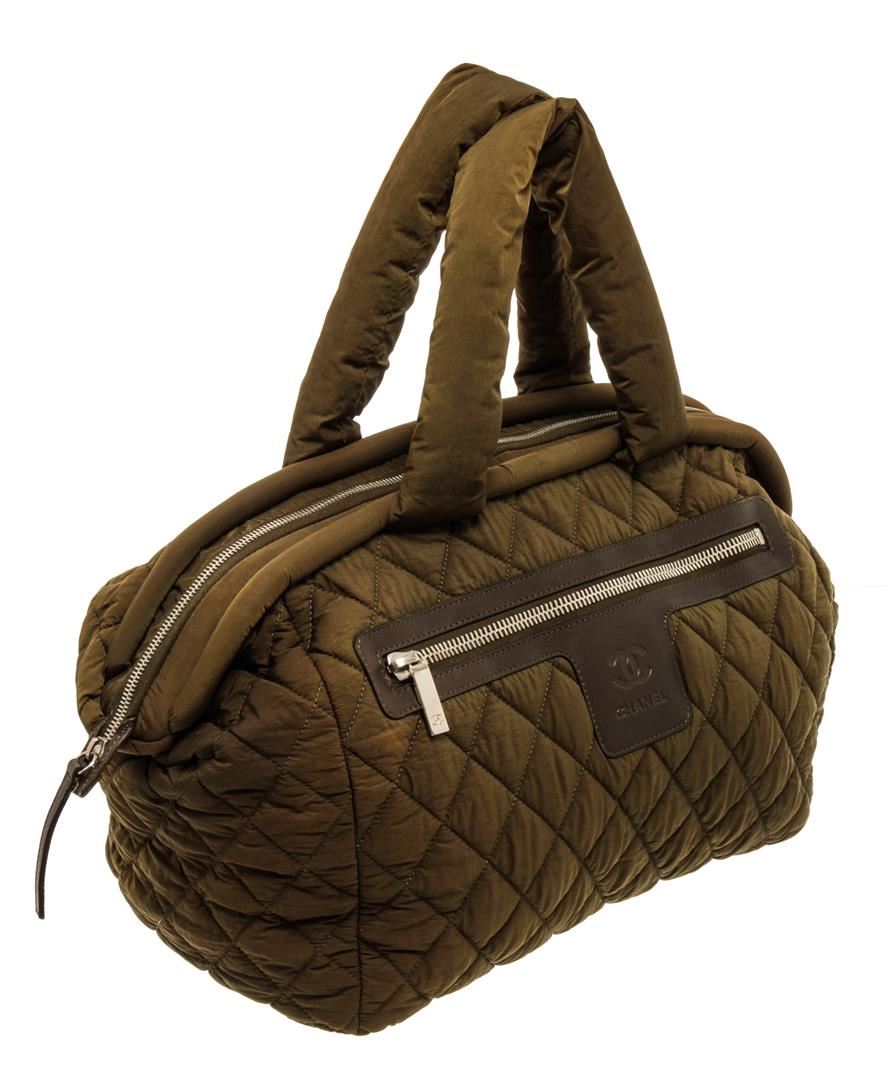 One Chanel Dark Green Quilted Nylon Cocoon Bowling Bag. Item is sold AS-IS. All available information is listed in the description and shown in the photo. Chanel Dark Green Quilted Nylon Cocoon Bowling Bag with silver-tone hardware, leather trim, front zip pocket, CC interlocking logo at the front leather, red nylon lining, interior zip pocket, dual nylon rolled handles, and zip closure at the top. .