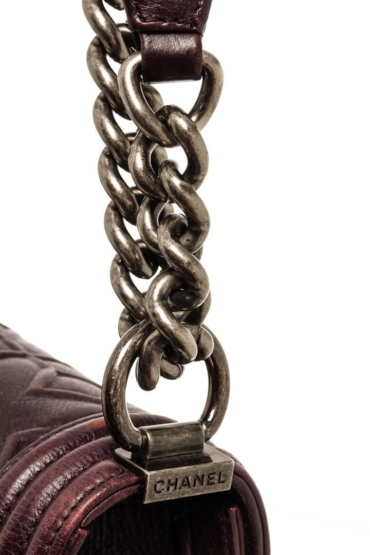 One Chanel Dark Purple Embossed Calfskin Boy Medium Flap Bag. Item is sold AS-IS. All available information is listed in the description and shown in the photo. Chanel Dark Purple Embossed Calfskin Boy Small Flap Bag with aged silver-tone hardware, grey canvas lining, interior zip pocket, chain leather shoulder strap, and flap closure with CC push lock. .