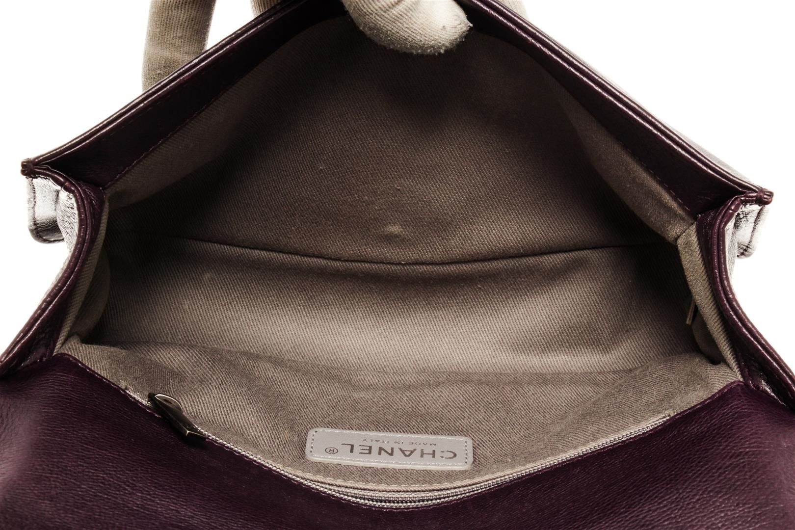 One Chanel Dark Purple Embossed Calfskin Boy Medium Flap Bag. Item is sold AS-IS. All available information is listed in the description and shown in the photo. Chanel Dark Purple Embossed Calfskin Boy Small Flap Bag with aged silver-tone hardware, grey canvas lining, interior zip pocket, chain leather shoulder strap, and flap closure with CC push lock. .